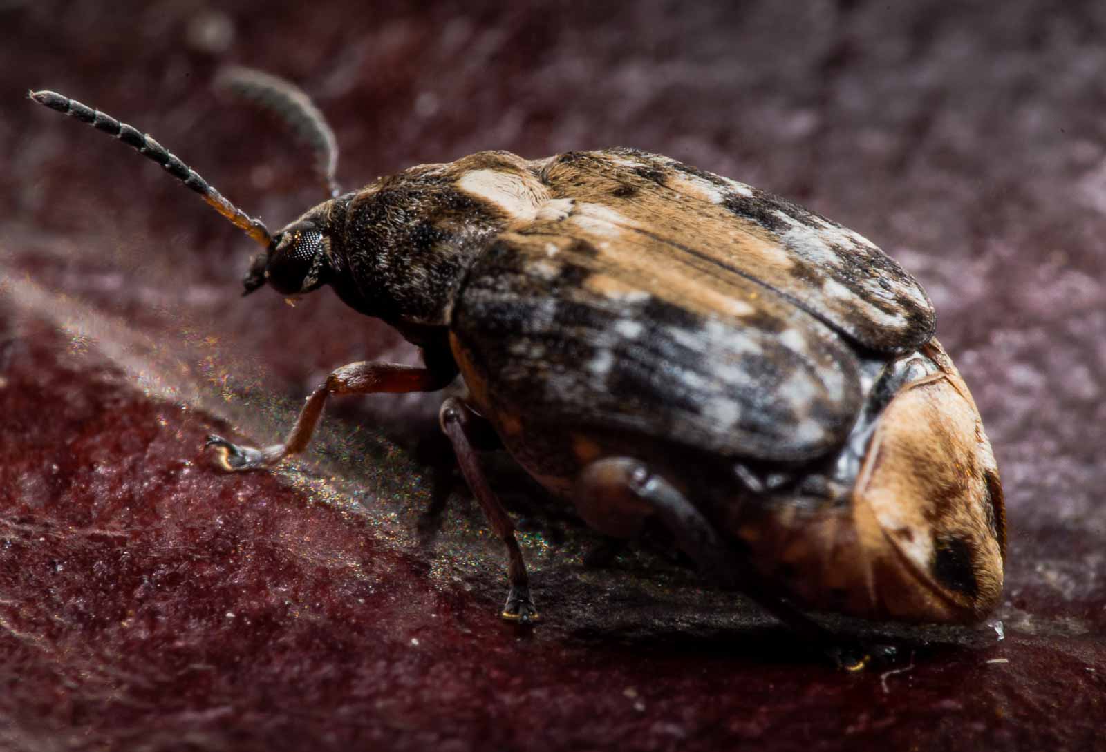 | Lebensraum: | in Parks, im Siedlungsbereich, Entwicklung der Larven in Hülsenfrüchten (jeweils nur eine Larve pro Samen), flugfähig |