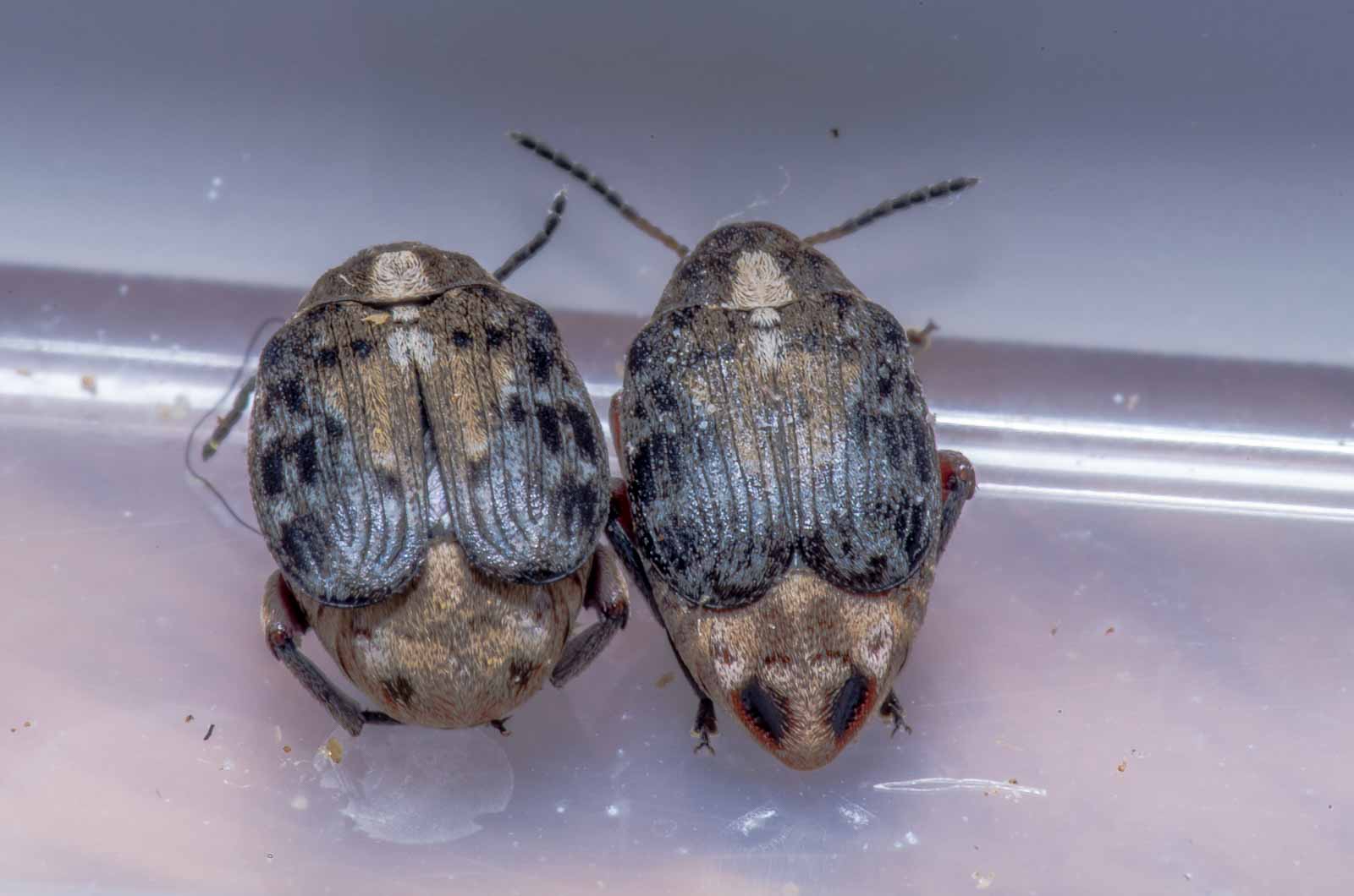 Auf einem Foto ist links ein totes Männchen und rechts ein noch lebendes Weibchen nebeneinander von hinten zu sehen, so dass man das Geschlecht eindeutig an den Punkten des Abdomens identifizieren kann.