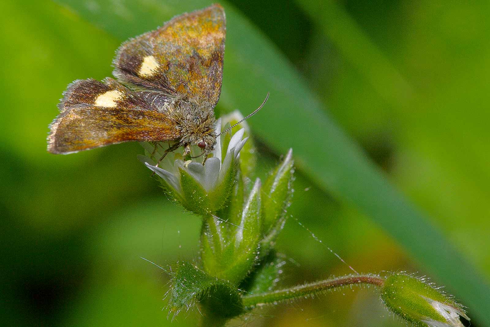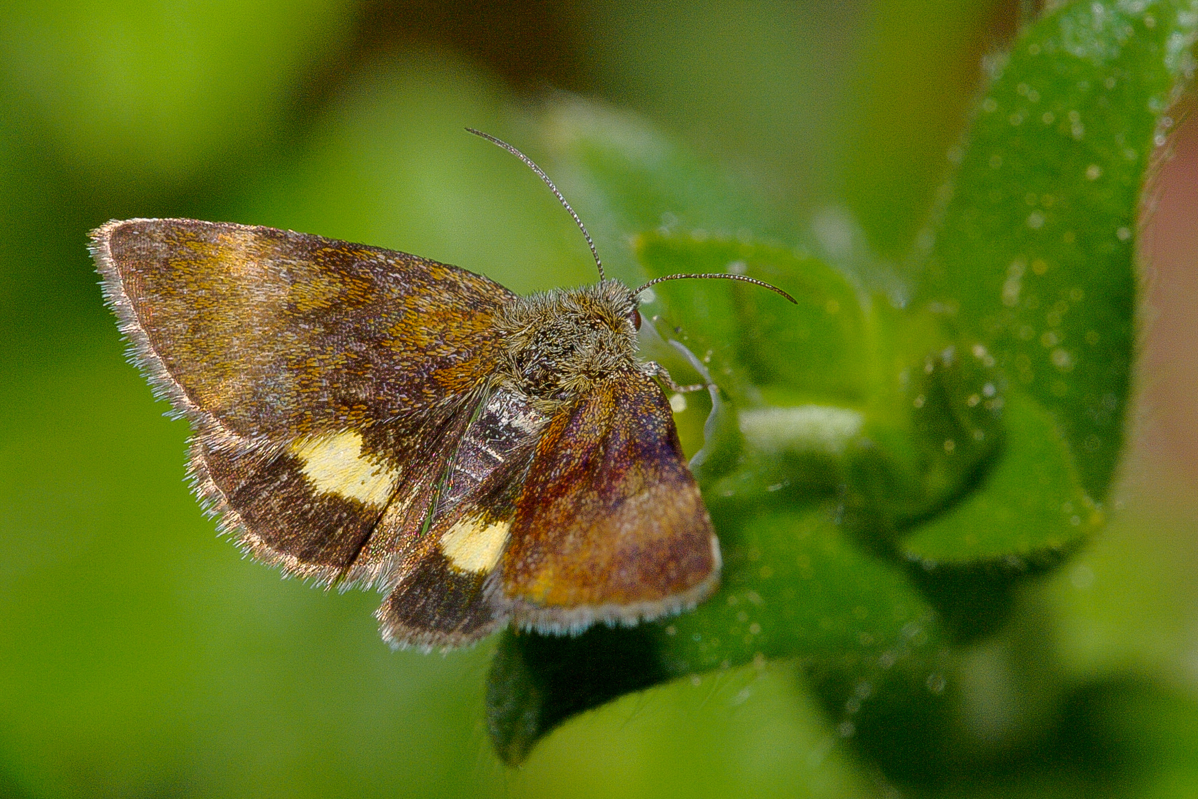 ie Falter erreichen eine Flügelspannweite von 25 bis 30 Millimetern. Sie haben graubraune Vorderflügel, auf denen zwei dunkel- oder rotbraune Querbinden und eine weitere braune Binde am Flügelaußenrand zu sehen sind. Des Weiteren haben sie nahe der Flügelspitze am Flügelvorderrand einen dunkel- oder rotbraunen, dreieckigen Fleck. Die Hinterflügel sind dunkelbraun und am äußeren Flügeldrittel gelb gefärbt.