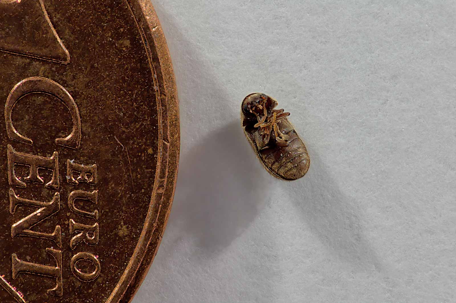 Larven der Brotkäfer werden etwa fünf Millimeter lang. Sie sind weiß mit einer starken Behaarung und braunem Kopf.