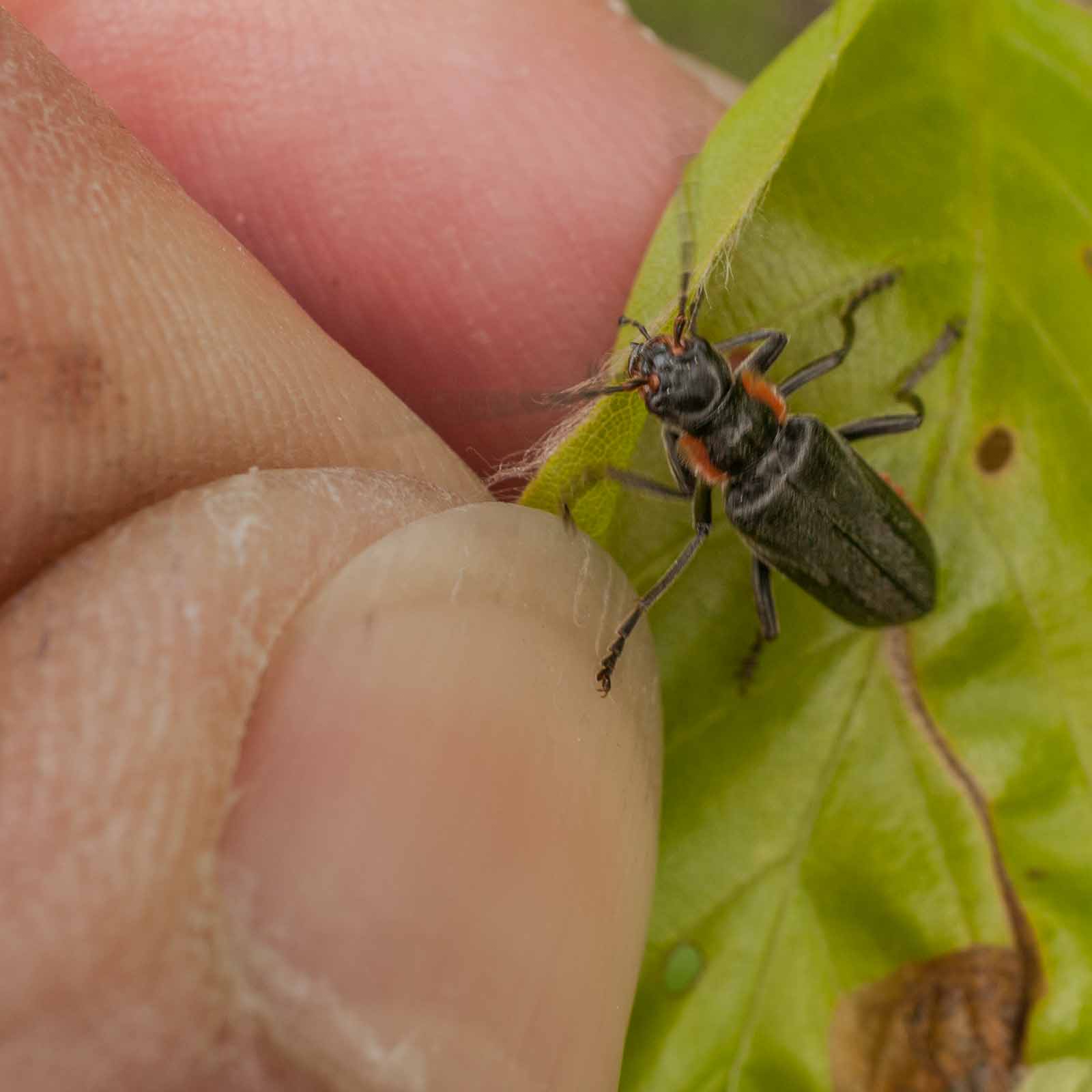 Es handelt sich um 8 bis 15 Millimeter lange, überwiegend schwarze Käfer mit weiß bis gelblich gerandetem Halsschild. Der Kopf ist durch die vorstehenden Augen so breit wie der Halsschild und schwarz bis auf die bis zu den Antennenbasen gelben Wangen, bis auf die Spitzen gelbe Mandibeln und Palpi, deren erste beiden Glieder ebenfalls gelb sind. Die Antennen sind dünn und reichen nach hinten gelegt etwa die Mitte der Flügeldecken. Im Gegensatz zur ähnlichen Art Cantharis liburnica ist das zweite Fühlerglied nicht verbreitert. Der Halsschild ist breiter als lang, mit glattem Hinterrand und ist im Vergleich zum Dunklen Fliegenkäfer (Cantharis obscura) deutlich runder an den Seitenrändern. Die Flügeldecken sind fein punktiert und hell, kurz behaart. Männchen können von ähnlichen Arten der Gattung auch durch den Bau ihrer Genitalien unterschieden werden. Die Geschlechter sind gleich gefärbt, wobei die Weibchen meist kräftiger gebaut sind und die Männchen einen kräftigen Zahn an der inneren Vorderkralle besitzen.