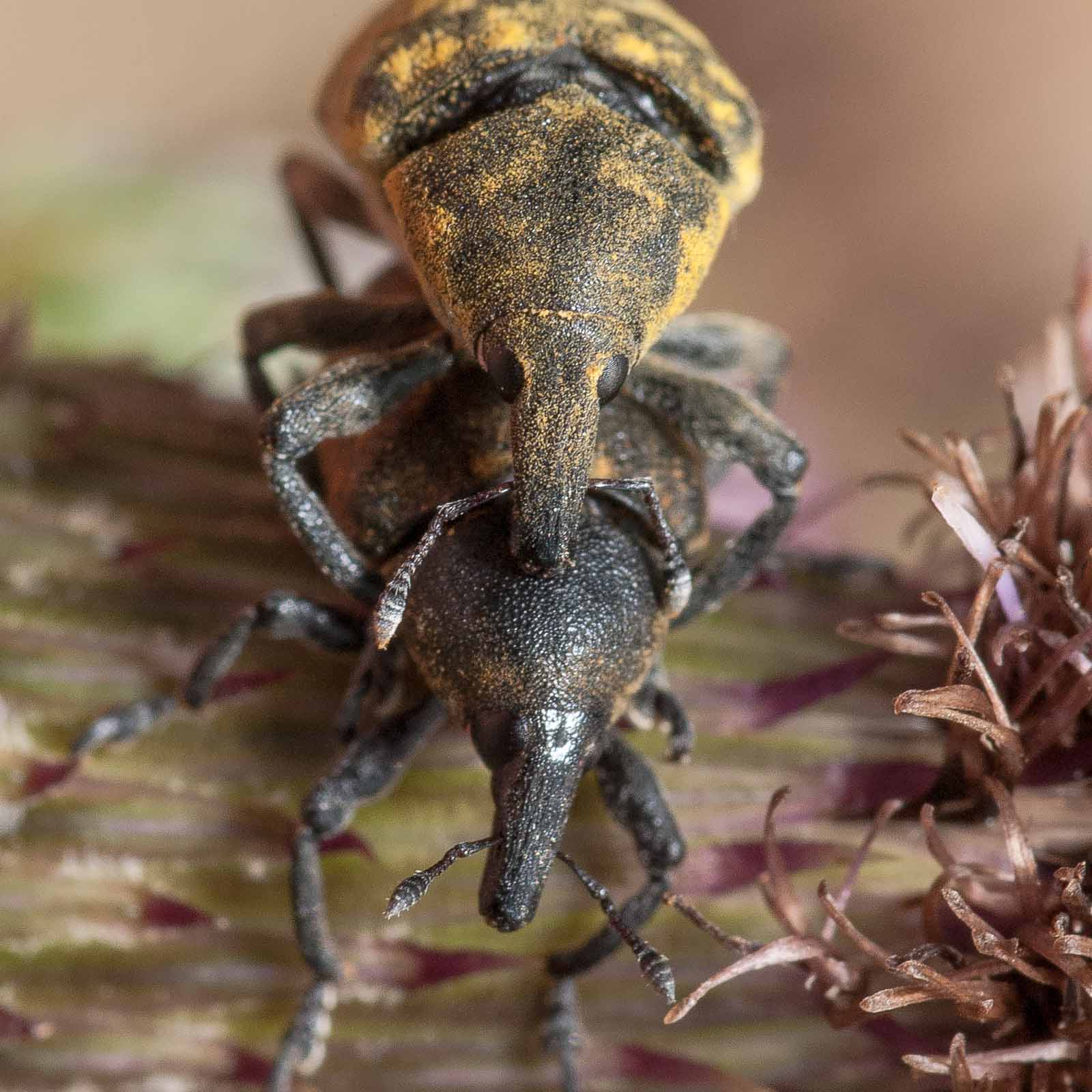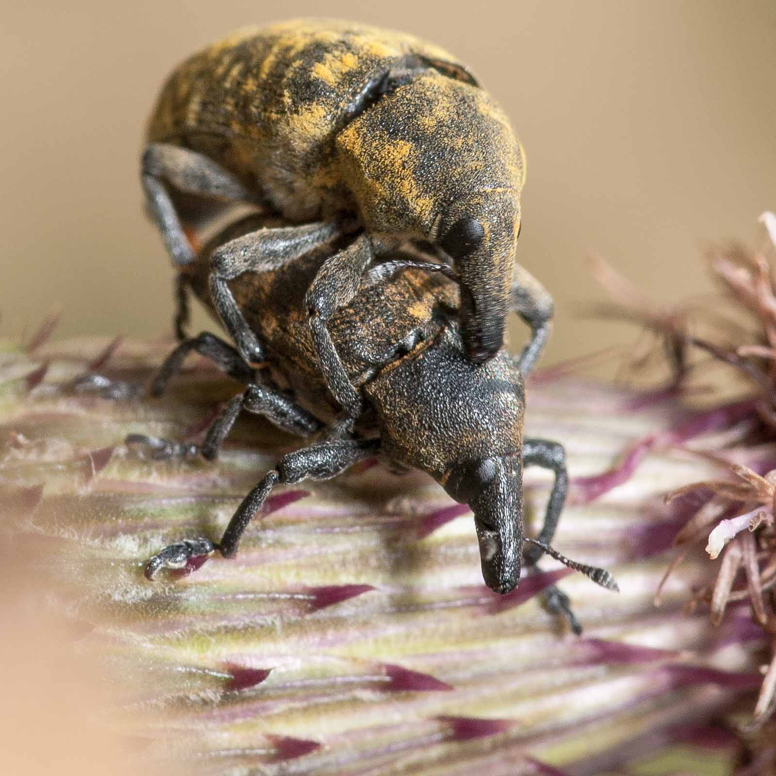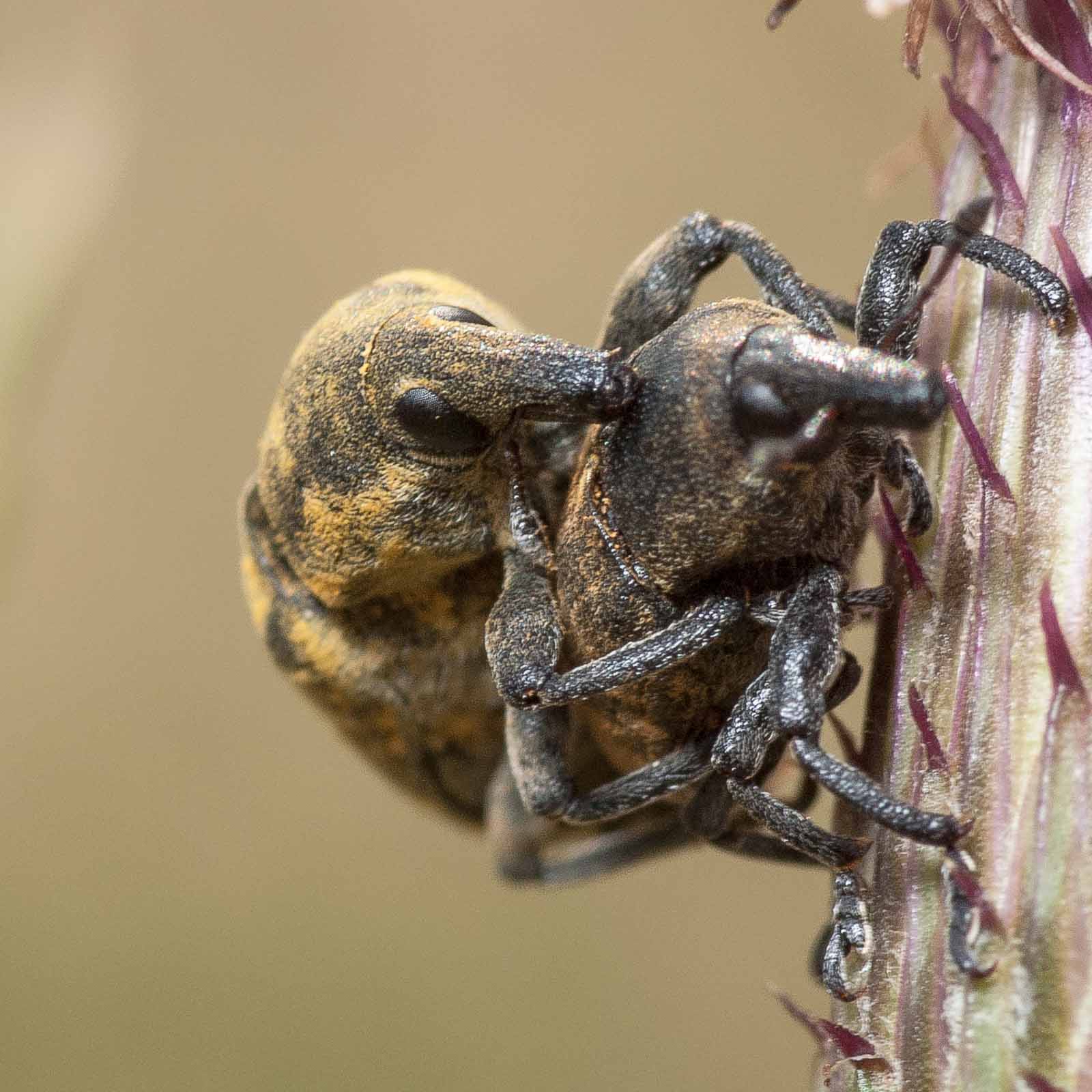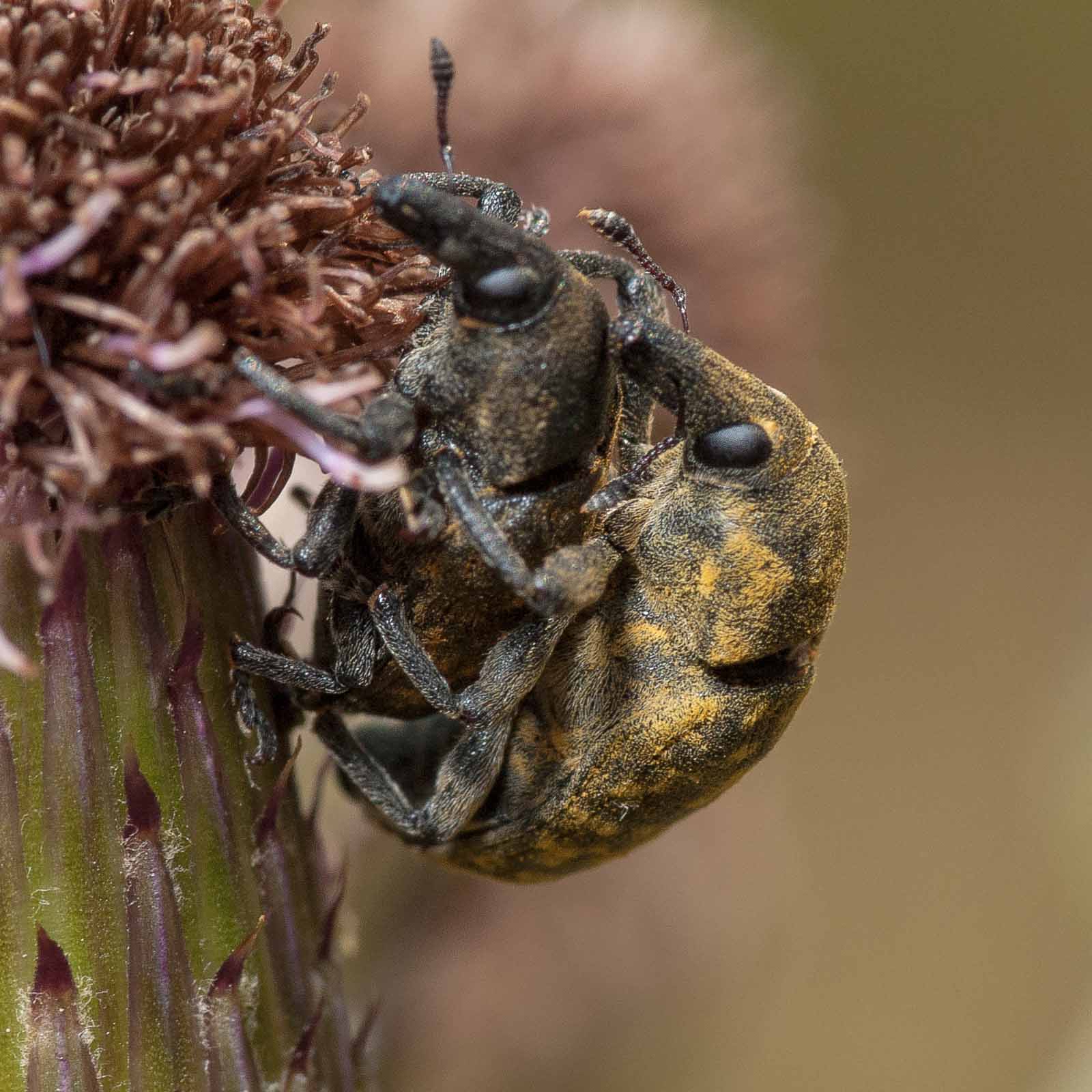 Die Larven entwickeln sich im Wurzelhals verschiedener Distelgewächse (Nickende Distel, Weg-Distel, Gewöhnliche Kratzdistel, Acker-Kratzdistel, Kohldistel, Eselsdistel, Mariendistel, Wollkopf-Kratzdistel) sowie Große und Kleine Klette. Käfer wurden auch aus den Wurzelgallen verschiedener Flockenblumenarten (Centaurea maculosa, Centaurea diffusa, Centaurea arenaria) gezogen. Hauptwirt ist jedoch die Acker-Kratzdistel.