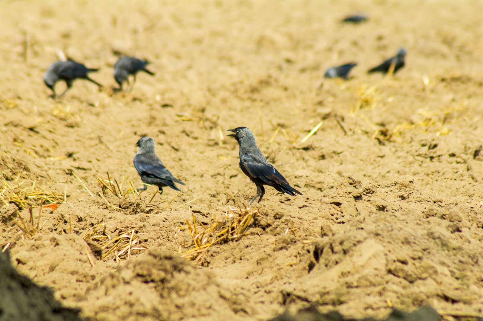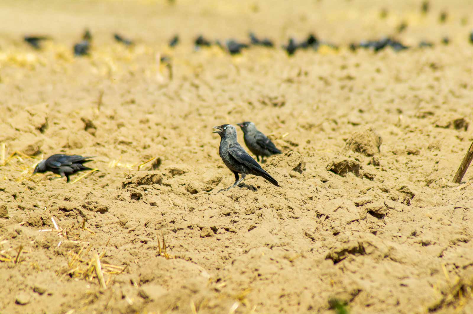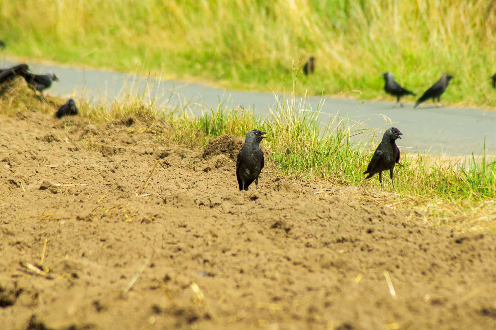 Gleichzeitig benötigt die Art relativ weiträumige, offene Flächen, um auf dem Boden nach Nahrung zu suchen. Diese Flächen müssen niedrige Vegetation (maximal 15–20 cm) aufweisen, damit sich die Dohle auf ihnen bewegen kann, bevorzugt werden folglich Parkflächen und Weideland. Weil sie außerdem insektenreich sein sollten, nutzt die Dohle gerne Trockenrasen und extensiv bewirtschaftete Flächen. Die Nahrungsgründe befanden sich in Feldstudien außerhalb der Brutzeit 0,5–3,1 km von den Schlafplätzen entfernt, während der Brutzeit lagen sie in 0,4–2,4 km Entfernung vom Nest. Im Laufe des Jahres nutzt die Dohle sehr unterschiedliche Flächen – Weideland, Steppen, Stoppelfelder, Überschwemmungsflächen – für die Nahrungssuche.