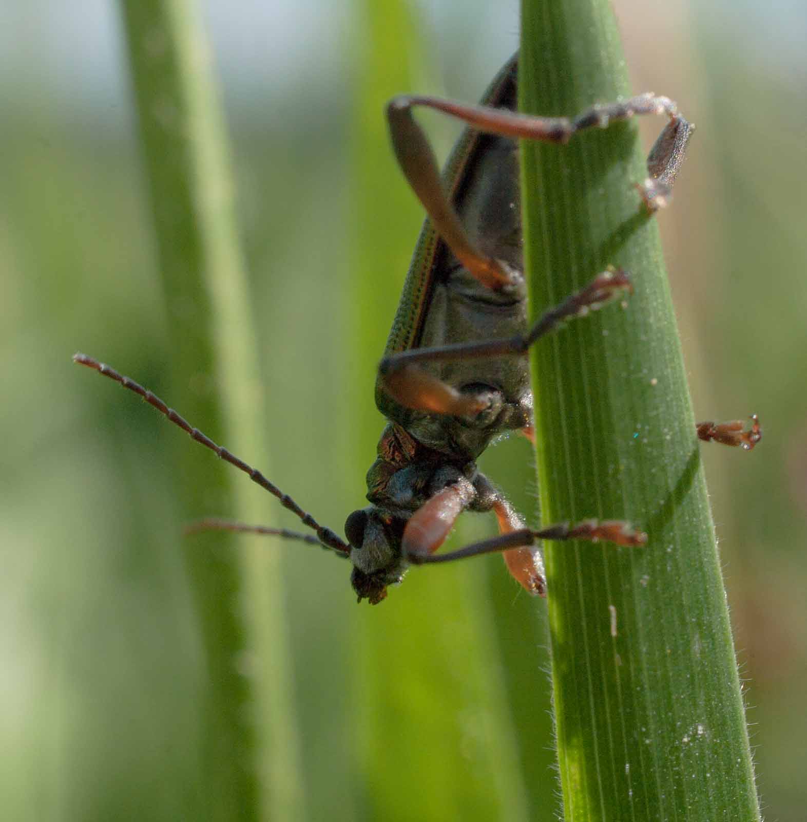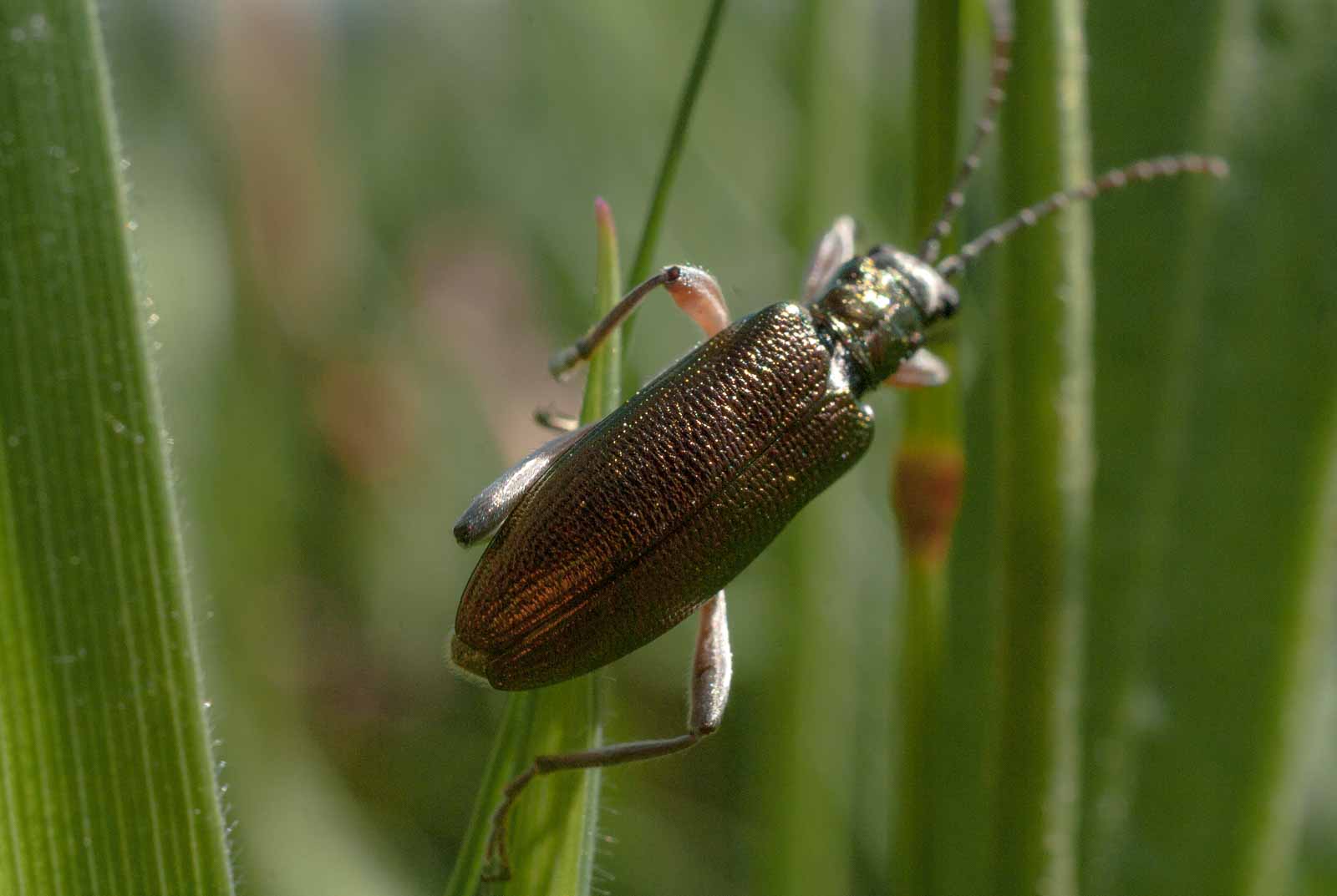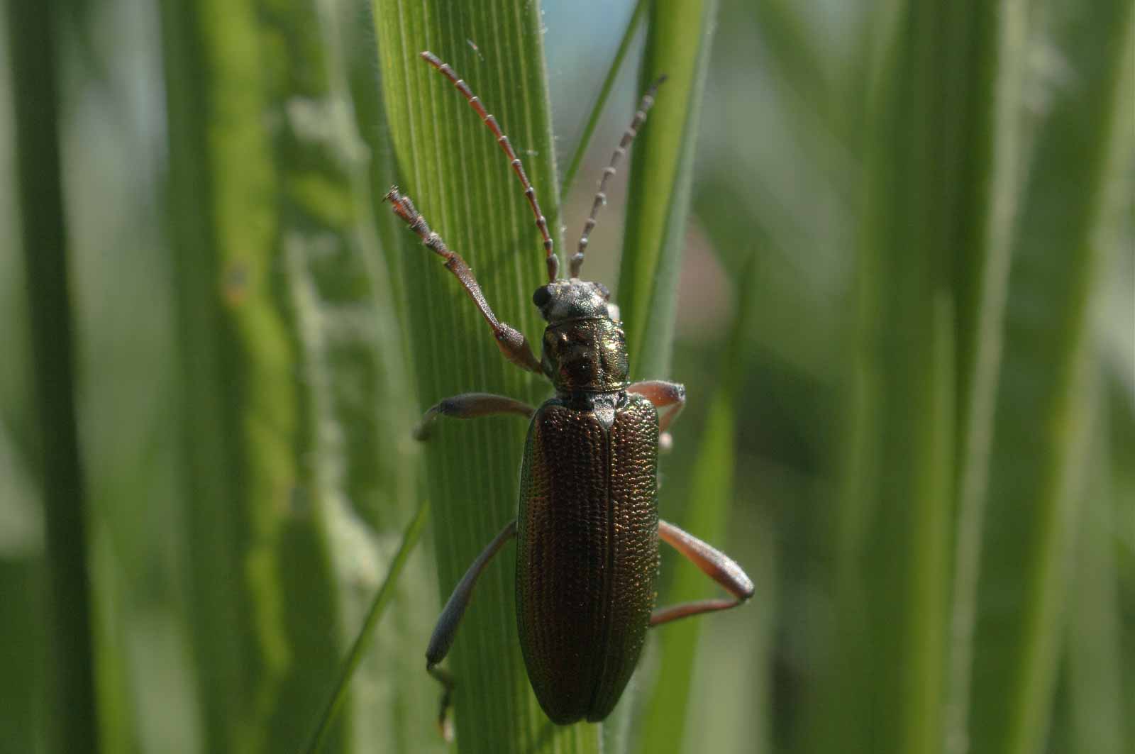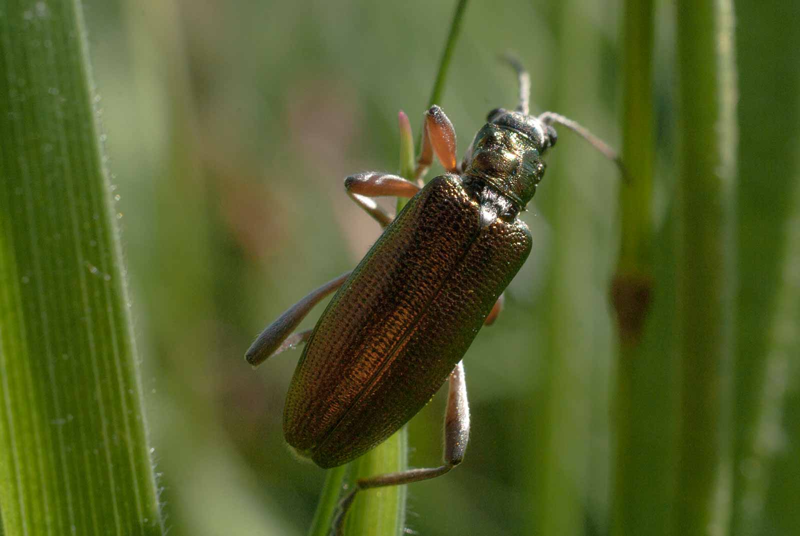 Erwachsene Käfer sind 7-12 Millimeter lang. Elytron ist ganz oben abgerundet. Hinterfemur erreicht die Spitze des Elytrons, die keine Zähne haben. Elytron hat keine Einkerbungen. Antenne und Beine sind rötlich gefärbt, die Oberseite ist bronzegrün.