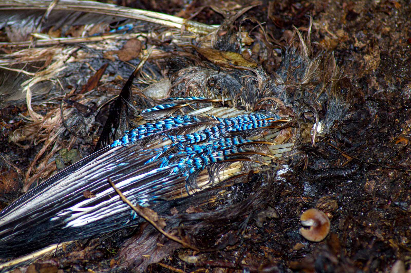 Auffällig und charakteristisch sind die rundlichen, breiten Flügel gefärbt. Die beigerosa Färbung der Oberseite setzt sich auf Randdecken und mittleren Armdecken fort. Handdecken, Fittich und große Armdecken sind auf der Innenfahne schwarz und tragen an der Außenfahne auf himmelblauem Grund eine schwarze Querbänderung. Diese farbenprächtige Gefiederpartie, die beim sitzenden Vogel ein aus der Ferne leuchtend blaues Feld unterhalb der Schulter bildet, ist ein besonders charakteristisches Artmerkmal. Die Handschwingen sind dunkelbraun mit einem hellen Saum, der zu den inneren Handschwingen hin zunehmend eine blau-schwarze Querbänderung trägt. Die Armschwingen sind schwarzbraun mit einer zur Federbasis hin weißen Außenfahne. Diese bilden beim zusammengelegten Flügel ein weißes Feld und sind auch im Flug deutlich zu erkennen. Teils findet sich in den weißen Bereichen eine, meist nicht sichtbare blau-schwarze Bänderung. Zu den braunschwarzen Schirmfedern hin zeigen mehrere Armschwingen eine kastanienbraune Färbung mit breitem, schwarzen Endsaum.