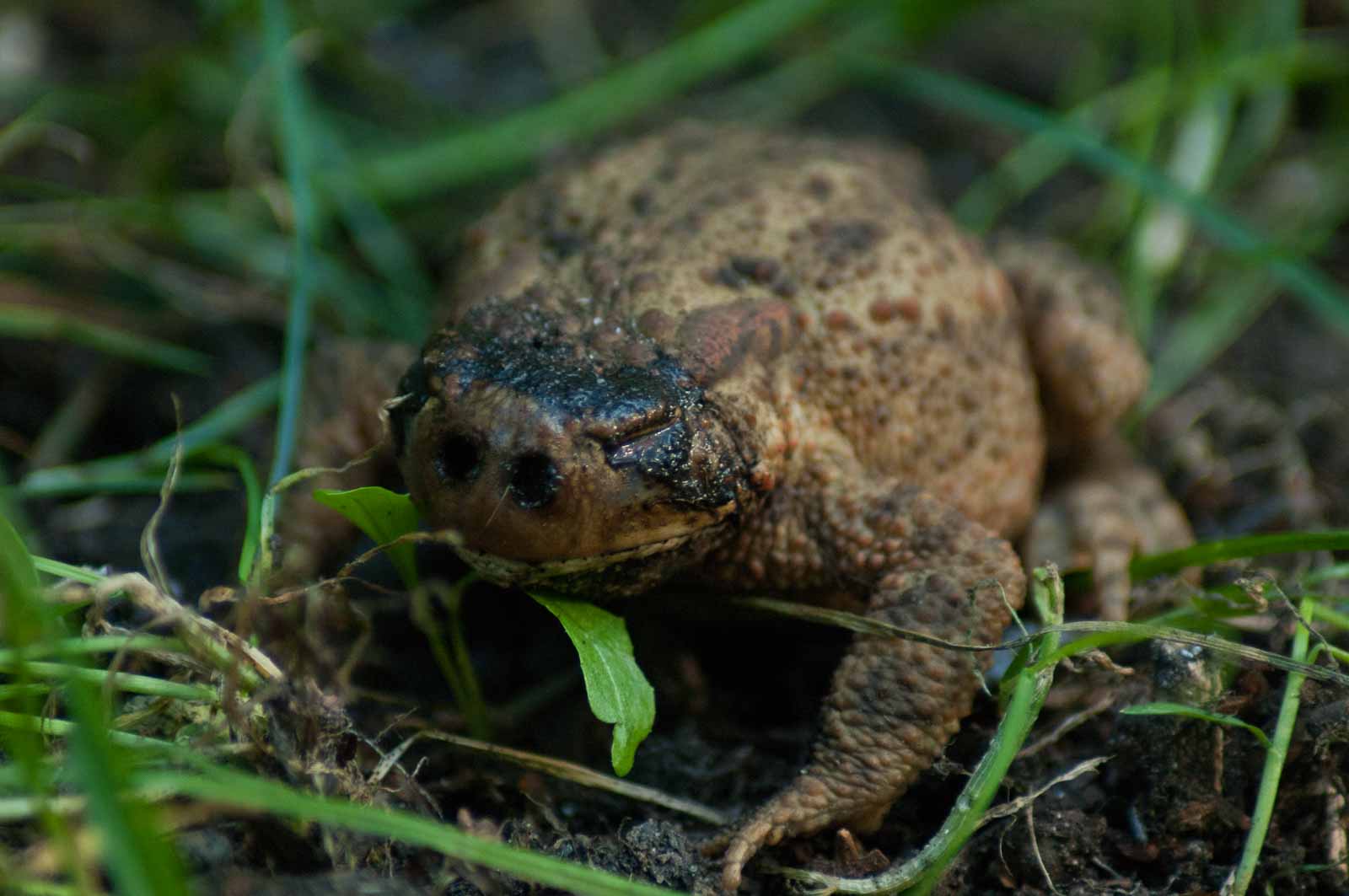 Erdkröte (im fortgeschrittenen Stadium parasitiert von den Larven der Krötengoldfliege)