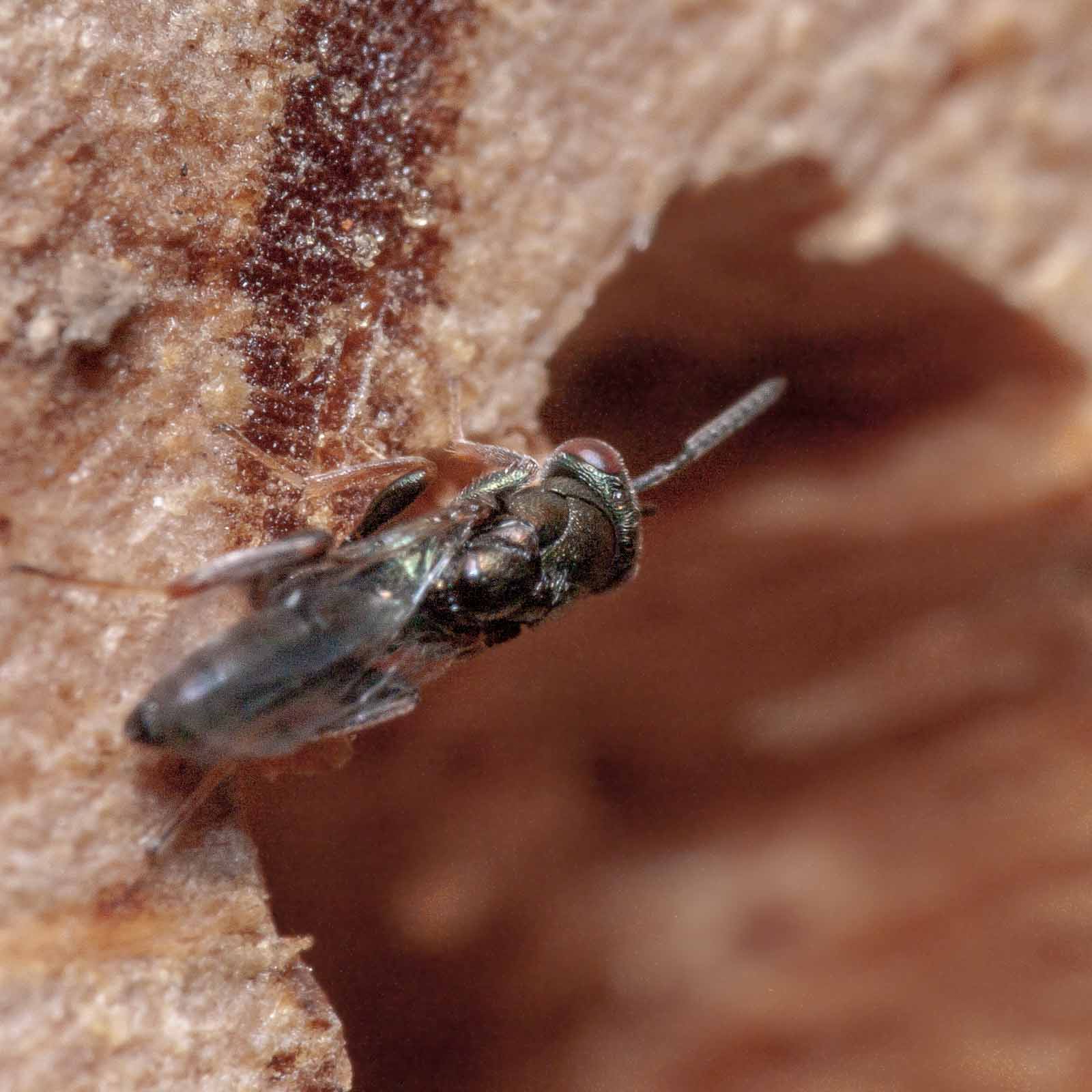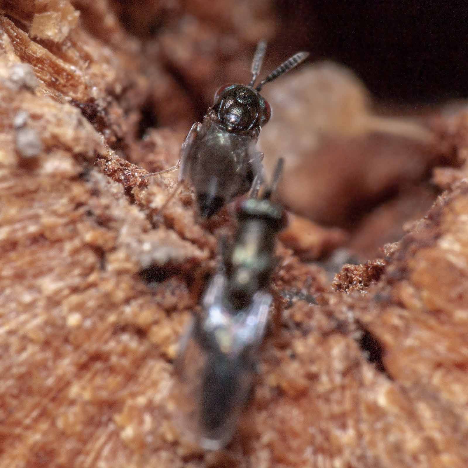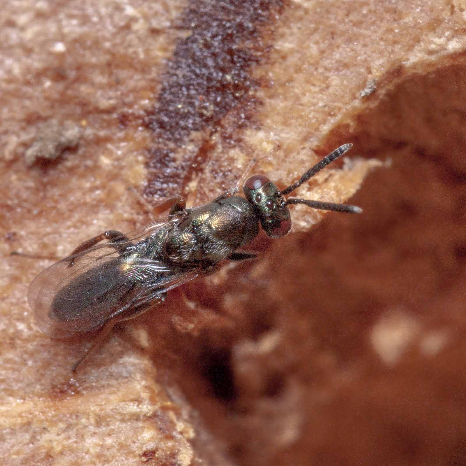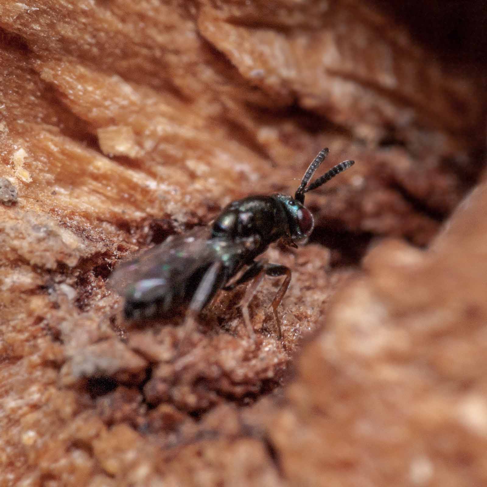 Die Erzwespen haben lange Sensillen auf den Fühlern, die oft als parallele weiße Linien entlang der Fühlerglieder zu erkennen sind.