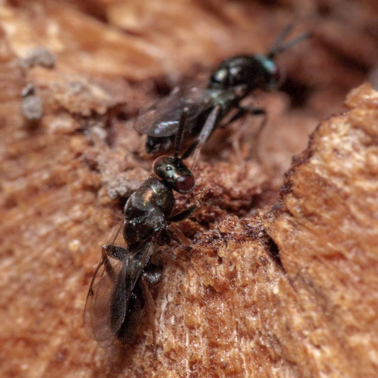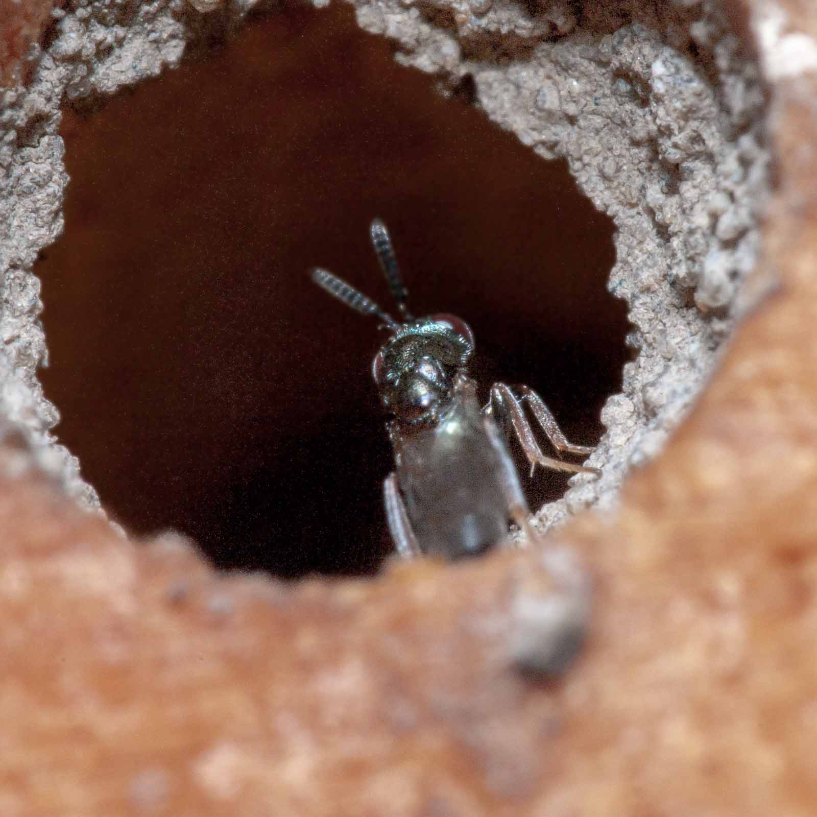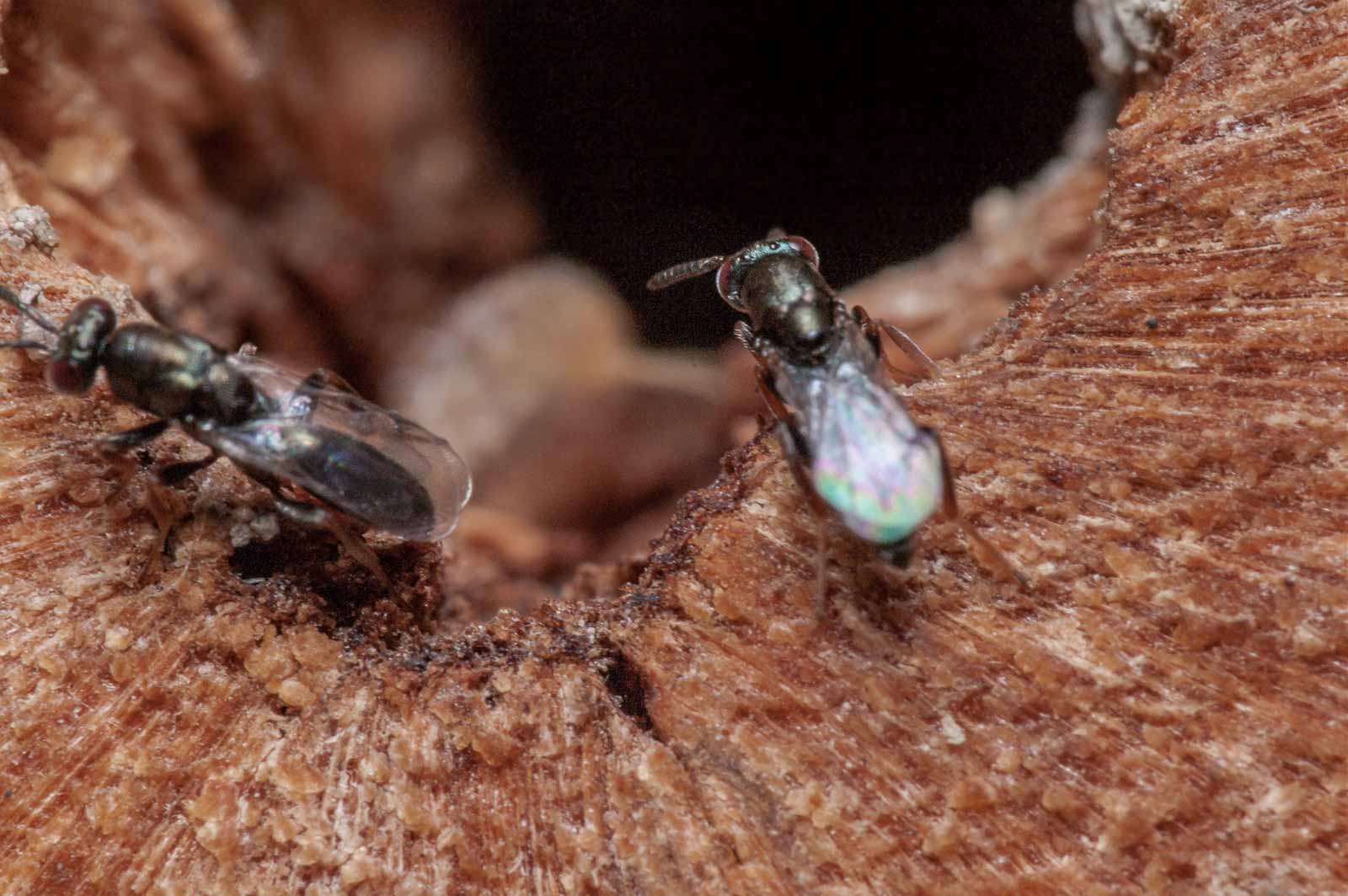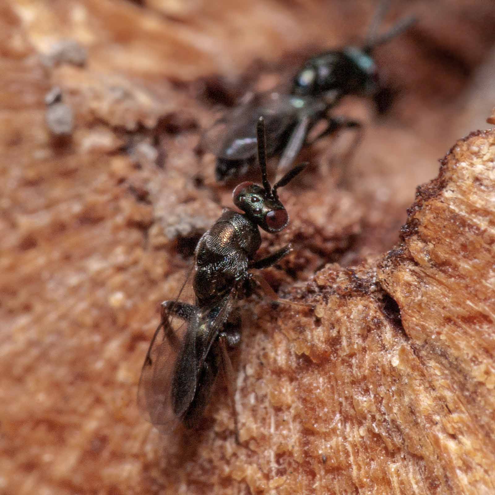 Die Erzwespen haben lange Sensillen auf den Fühlern, die oft als parallele weiße Linien entlang der Fühlerglieder zu erkennen sind.