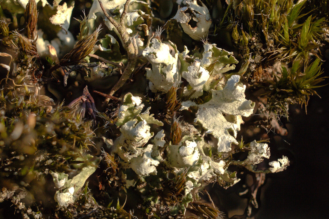 - Laub- oder Blattflechten: Die Flechte ist flächig gestaltet (folios) und liegt mehr oder weniger locker auf dem Substrat auf. Morphologisch sind die Blattflechten sehr vielfältig und besiedeln verschiedene Lebensräume wie etwa auf Moosen, aber auch auf Gestein. Wie bei Pflanzenblättern optimiert der blattartige Wuchs die Lichtausbeute für die Photosynthese des Photobionten. Die Wachstumszone befindet sich auf den „Blatträndern“.