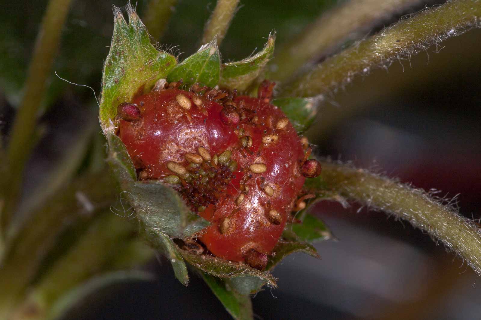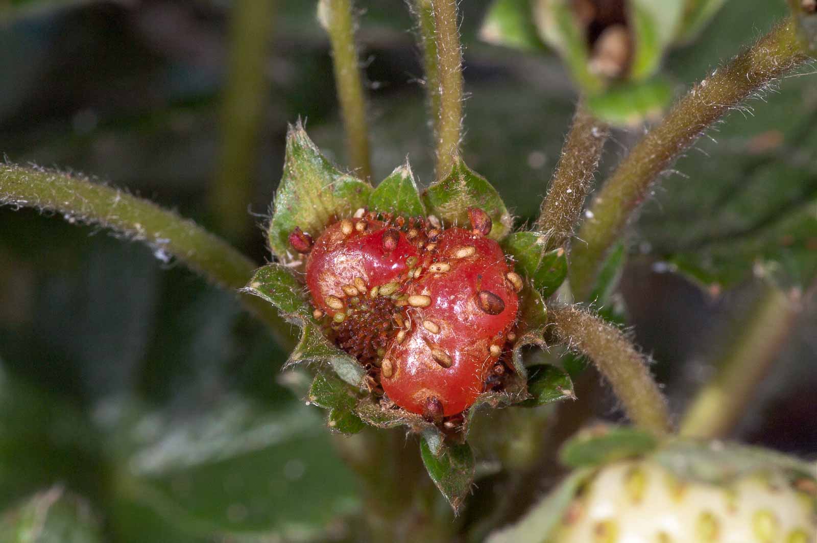 Bei Erdbeeren liegt die Hauptgefahr in pilzlichen Schädlingen. Der wichtigste ist die Grauschimmelfäule (Botrytis cinerea). Daneben treten auch Phytophthora cactorum und Phytophthora fragariae, Sphaerotheca macularis sowie Mycosphaerella fragariae auf. Zu den Schadinsekten gehören der Erdbeerblütenstecher (Anthonomus rubi), die Erdbeermilbe (Steneotarsonemus pallidus fragariae)[27], der Gefurchte Dickmaulrüssler (Otiorrhynchus sulcatus) sowie Thripse.