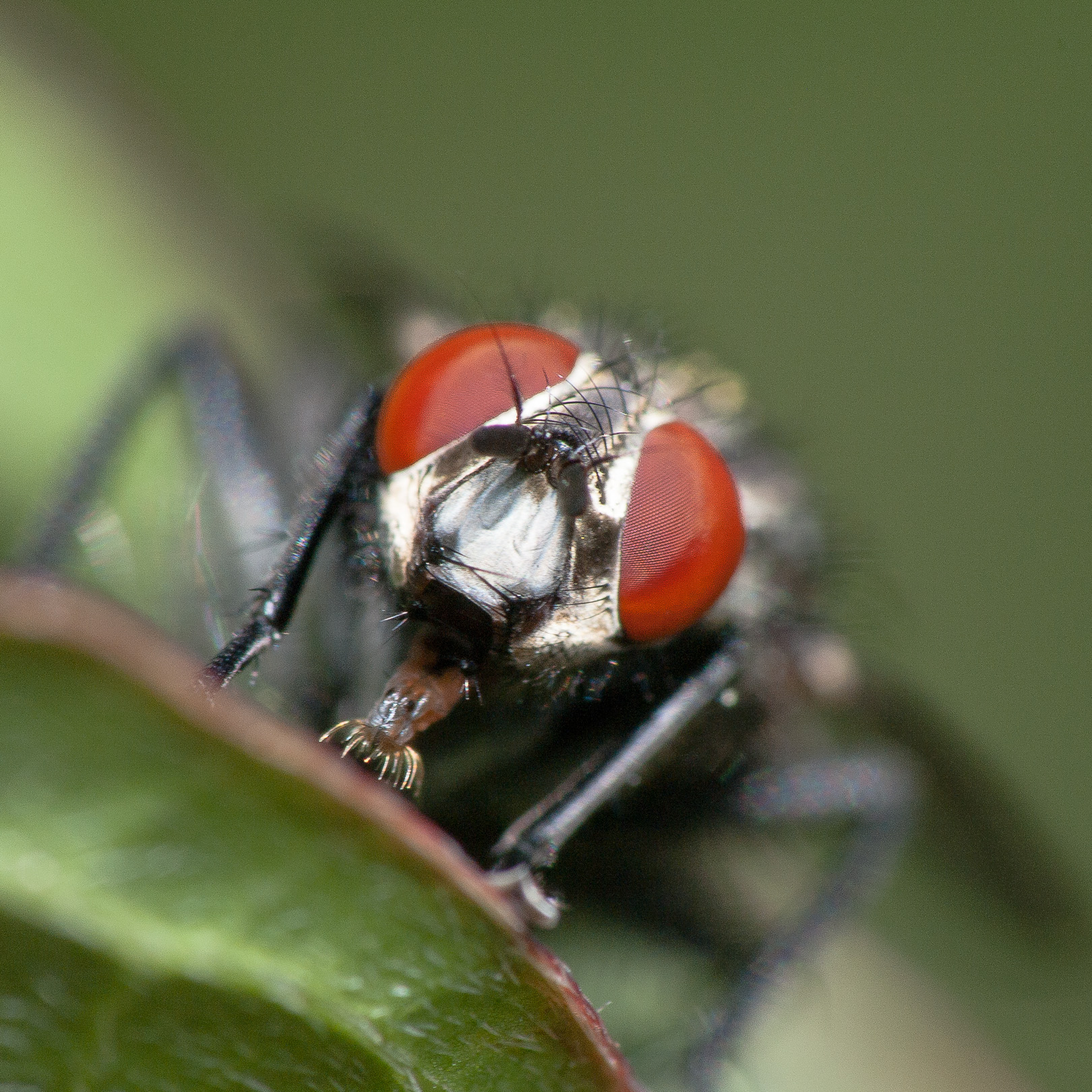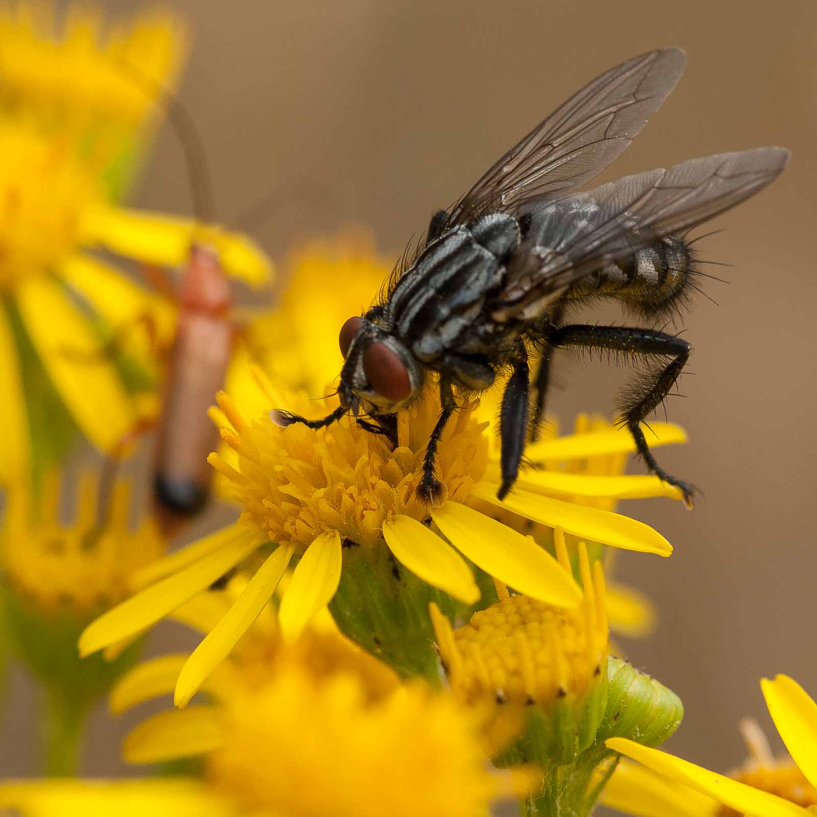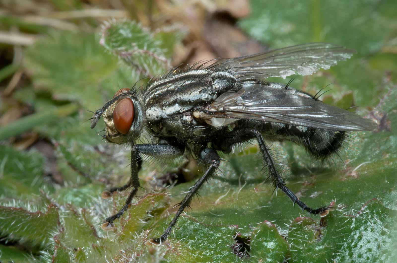 Thorax silbrig grau bestäubt, Mesonotum mit 4 schwarzen Längsstreifen, beim Männchen die beiden mittleren zusammengeflossen; Schildchen (Scutellum) mit einem dreieckigen schwarzen Fleck und zwei kleinen schwarzen Flecken an den Seiten; Hinterleib kurz und breit, beim Männchen teils rötlich, beim Weibchen schwarz mit hellen Schillerflecken; Beine schwarz; Fühlerborste (Arista) lang gefiedert.