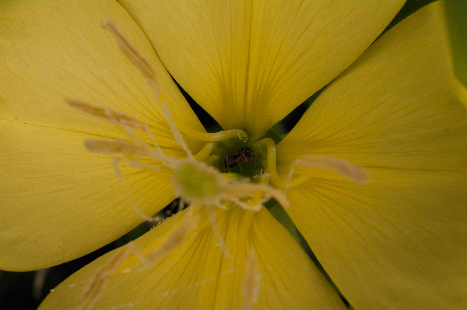 Beim Öffnen der „Stieltellerblüte“ stäuben zunächst die reifen Staubbeutel, weshalb die Blüte als vormännlich bezeichnet wird. Die zu etwa 50 % fertilen Pollenkörner sind über Viscinfäden miteinander verfilzt und bleiben dadurch leicht im Haarkleid oder an den Fühlern von Insekten hängen. Erst wenn die Staubbeutel entleert wurden, reifen die Narben heran. Diese liegen unmittelbar nach Blütenöffnung eng aneinander und entfalten sich im Laufe der Öffnung der Blüte. Nektar für bestäubende Insekten wird am Grunde der Kelchröhre von einer glatten, gelben Honigdrüse ausgeschieden, die oberhalb des Fruchtknotens liegt. Der Blütensaft fließt aufgrund der waagrechten Stellung der Blüte dem Ausgang zu, wo er am aufliegenden Griffel haften bleibt.