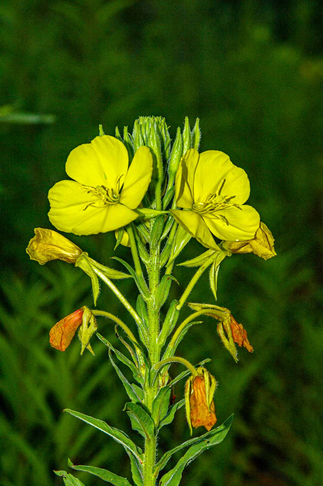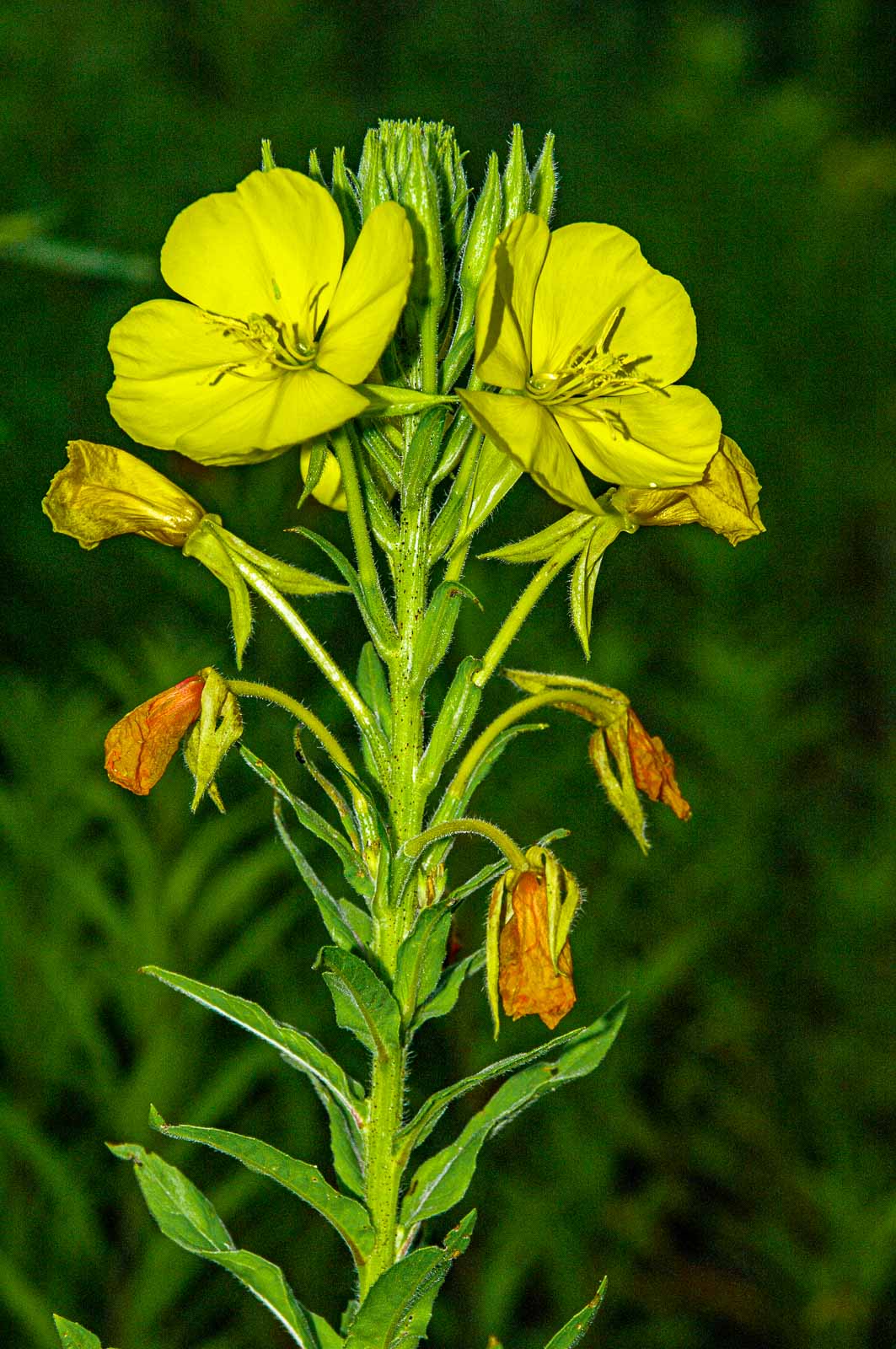 Die Gemeine Nachtkerze ist eine zweijährige krautige Pflanze, die Wuchshöhen von 0,8 bis 1,8, bei idealem Standort bis zu 2 Meter erreicht. Sie bildet im ersten Jahr eine auf dem Boden aufliegende Blattrosette mit fleischiger Pfahlwurzel. Im zweiten Jahr erhebt sich daraus ein grüner oder im unteren Bereich rötlich überlaufer, ungetupfter Stängel, dieser ist einfach oder spärlich verzweigt und dicht bis spärlich behaart.