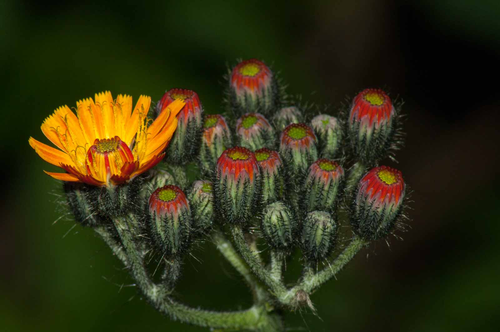 Die Blütezeit erstreckt sich in Nordamerika von Mai bis Juni sowie von August bis September während sie sich in der Schweiz von Juni bis August erstreckt. Der doldenartige Gesamtblütenstand enthält meist zwei bis sieben, gelegentlich auch zwölf oder mehr körbchenförmige Teilblütenstände. Der Blütenstandsschaft ist drüsig behaart. Das bei einer Länge von 0,6 bis 1 Zentimetern glockenförmige Involucrum enthält 13 bis 30, gelegentlich auch mehr an der Unterseite drüsig behaarte Hüllblätter. Die Blütenkörbchen enthalten 25 bis 120 oder mehr Zungenblüten. Die gelborange über orangen bis dunkel orangeroten Zungenblüten sind 1 bis 1,4 Zentimeter lang.
