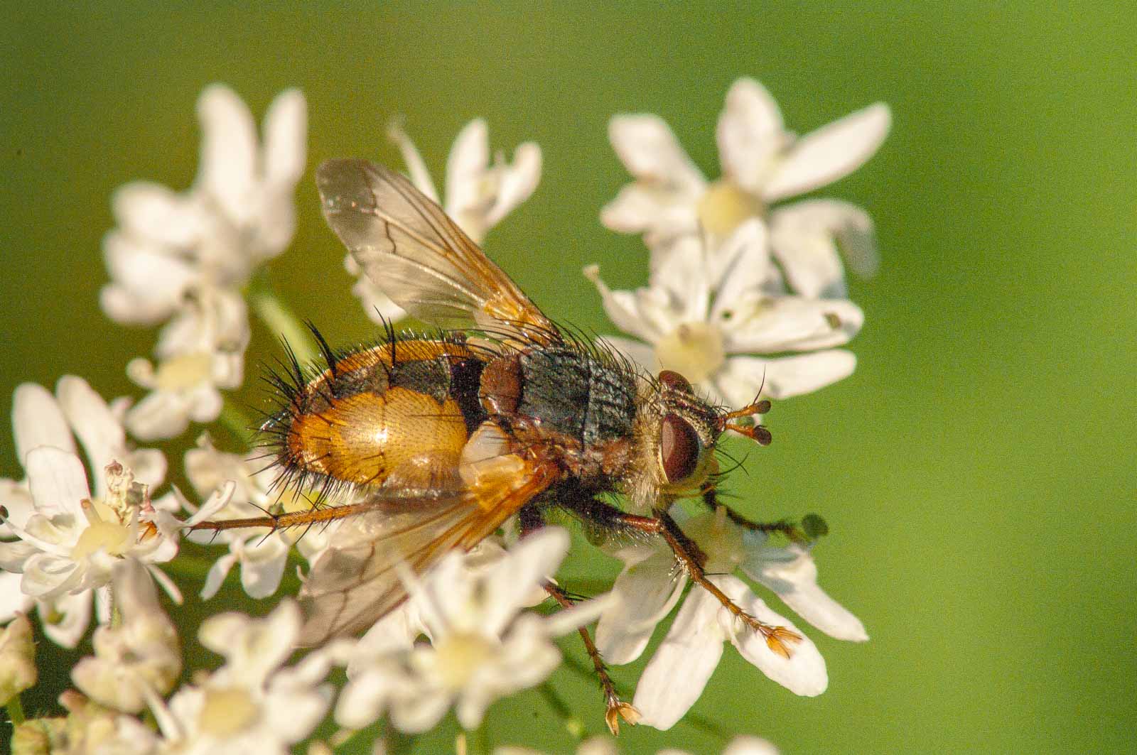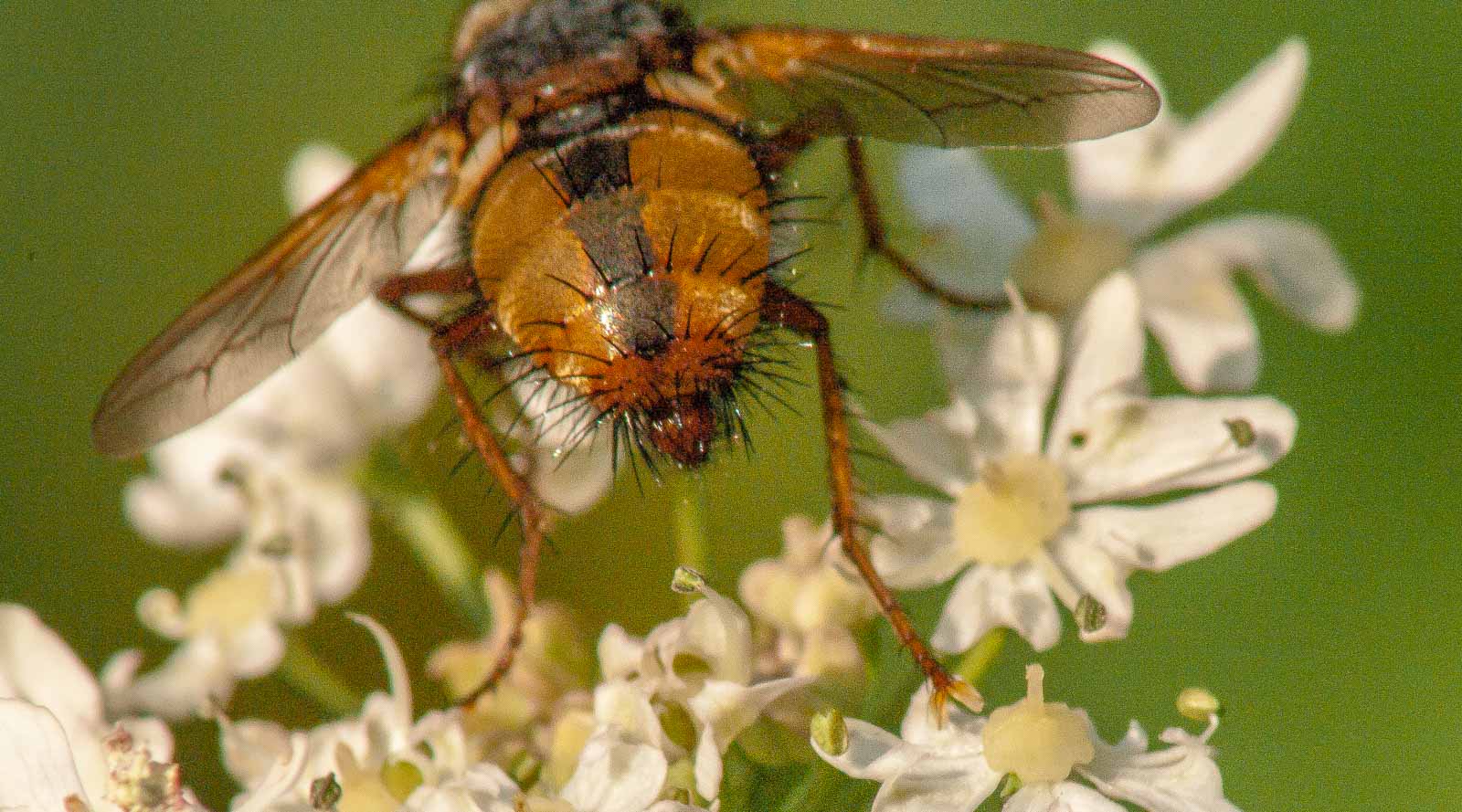 Die starken, schwarzen Borsten am Körperende verleihen der Igelfliege ihren deutschen Namen.