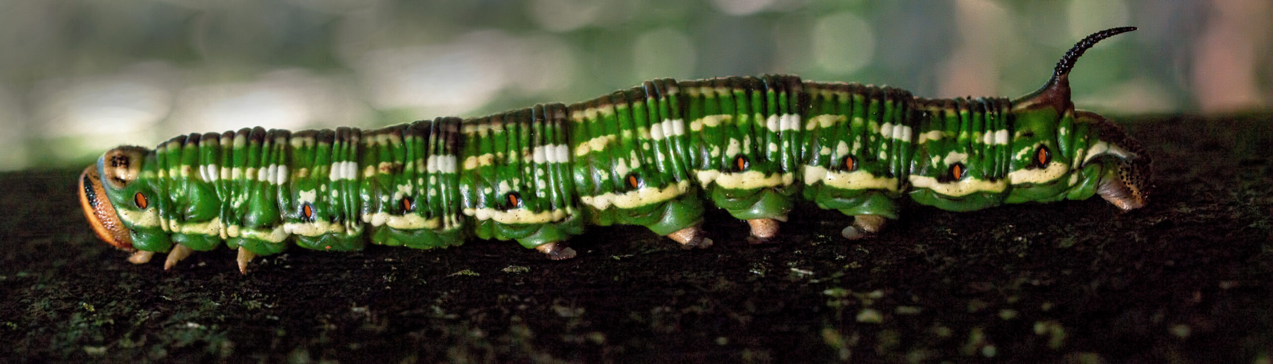Ausgewachsen sind die Raupen entweder grün und haben einen breit braun gefärbten Rücken und seitlich am Körper je drei weiße oder cremefarbene Längslinien, die mehr oder weniger zu Flecken aufgelöst sind, oder der Körper ist überwiegend braun gefärbt und besitzt ebenfalls cremefarbene Fleckenlinien an den Seiten. Das Analhorn ist in diesem Stadium dunkel gefärbt. Der Körper ist bei beiden Farbvarianten mit dicht aneinander liegenden, etwas vertieften, dunklen Querringen gerunzelt. Kurz vor der Verpuppung dunkelt die Körperfarbe aus und bekommt einen ölig schimmernden Glanz.