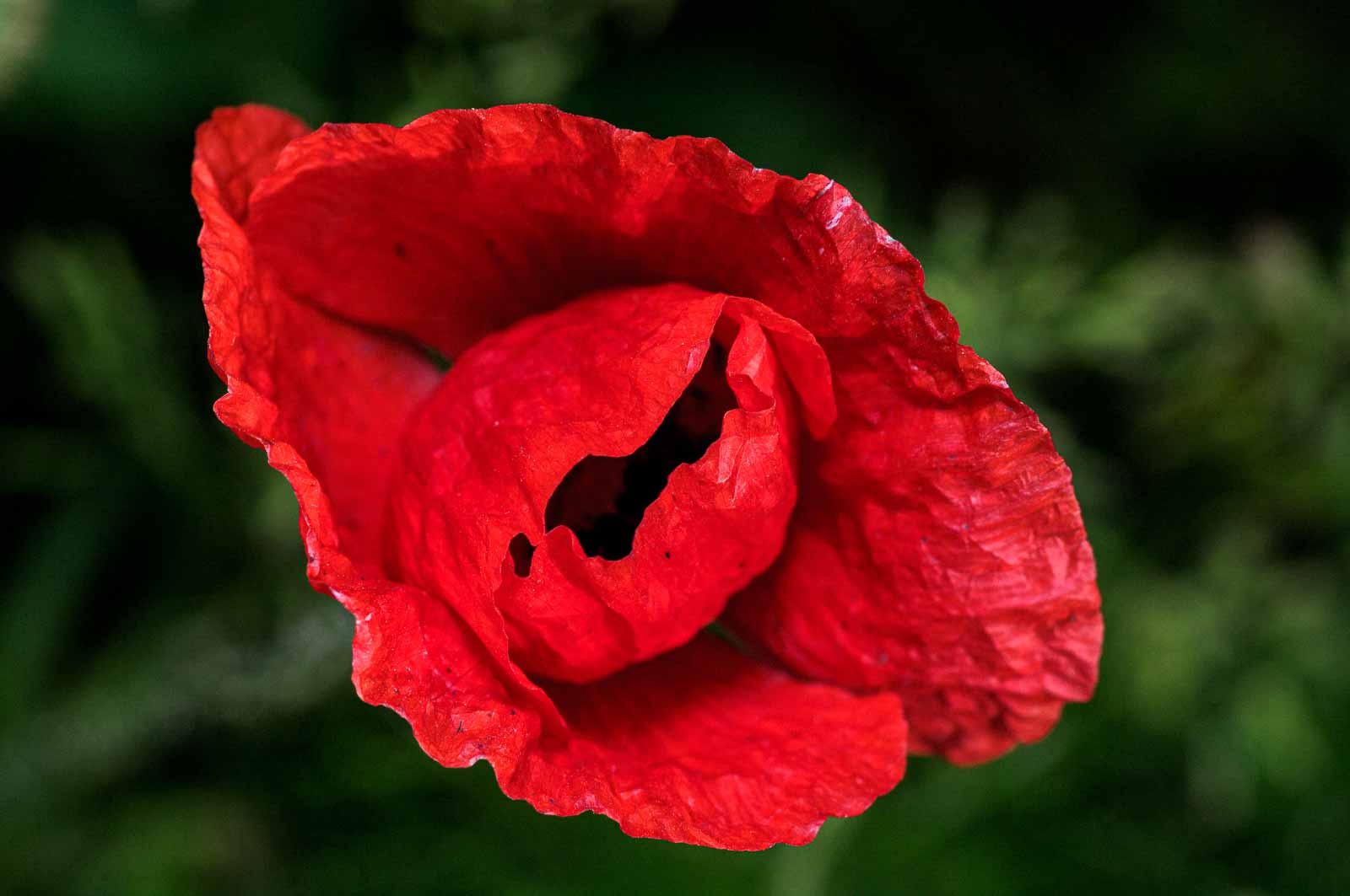Die Blütezeit reicht von Mai bis Juli. Die Blüten stehen einzeln, endständig auf dem Stängel. Die zwittrigen Blüten sind radiärsymmetrisch und vierzählig mit doppelter Blütenhülle. Die zwei behaarten Kelchblätter fallen beim Öffnen der Blütenknospe ab. Die Kronblätter sind in der Knospe unregelmäßig „zusammengeknautscht“. Die mit einem Durchmesser von 5 bis 10 Zentimetern relativ großen Blütenkronen können in Größe erheblich variieren. Die vier scharlach- bis purpurroten, selten weißen oder violetten Kronblätter besitzen im unteren Bereich einen großen schwarzen, oft weiß umrandeten Fleck, sind sehr dünn. Sie ähneln etwas knittrigem Papier und sind daher leicht zu erkennen. Es sind etwa 164 Staubblätter vorhanden. Die kurz kegelige Narbenscheibe besitzt meist 10 (5 bis 18) Narbenstrahlen.