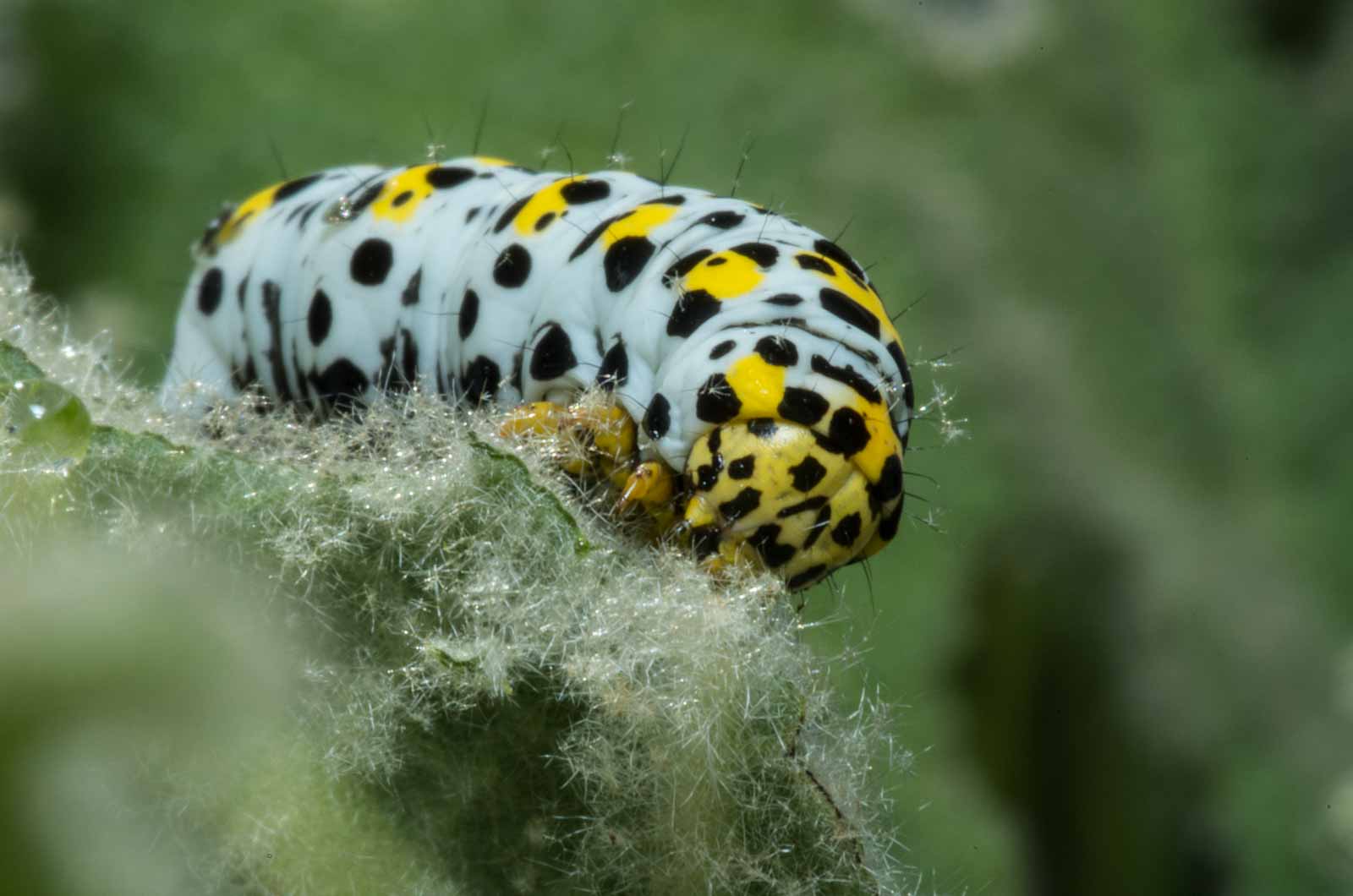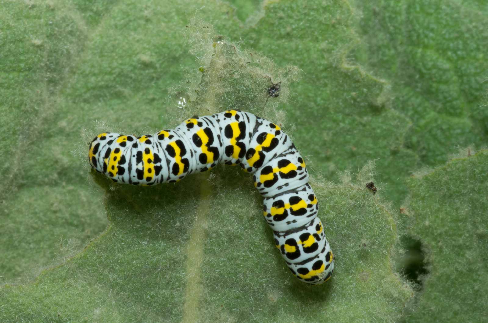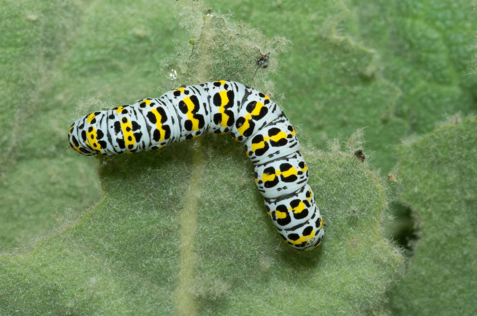 Erwachsene Raupen haben eine rein weiße, gelblichweiße oder grünlichweiße Grundfärbung. Auf jedem Segment befindet sich eine leuchtend gelbe, manchmal auch in einzelne Flecke aufgelöste Querbinde. An den Seiten und auf dem Rücken zeigt sich eine Vielzahl schwarzer Flecke und Striche. Diese sind etwas kleiner als bei der sehr ähnlichen Raupe vom Braunwurz-Mönch, die meist auch eine leicht bläulichweiße Grundfarbe aufweist. Am Körper befinden sich einige kurze, dünne Haare. Der Kopf ist groß, gelb und zeigt ein markantes schwarzes Fleckenmuster.