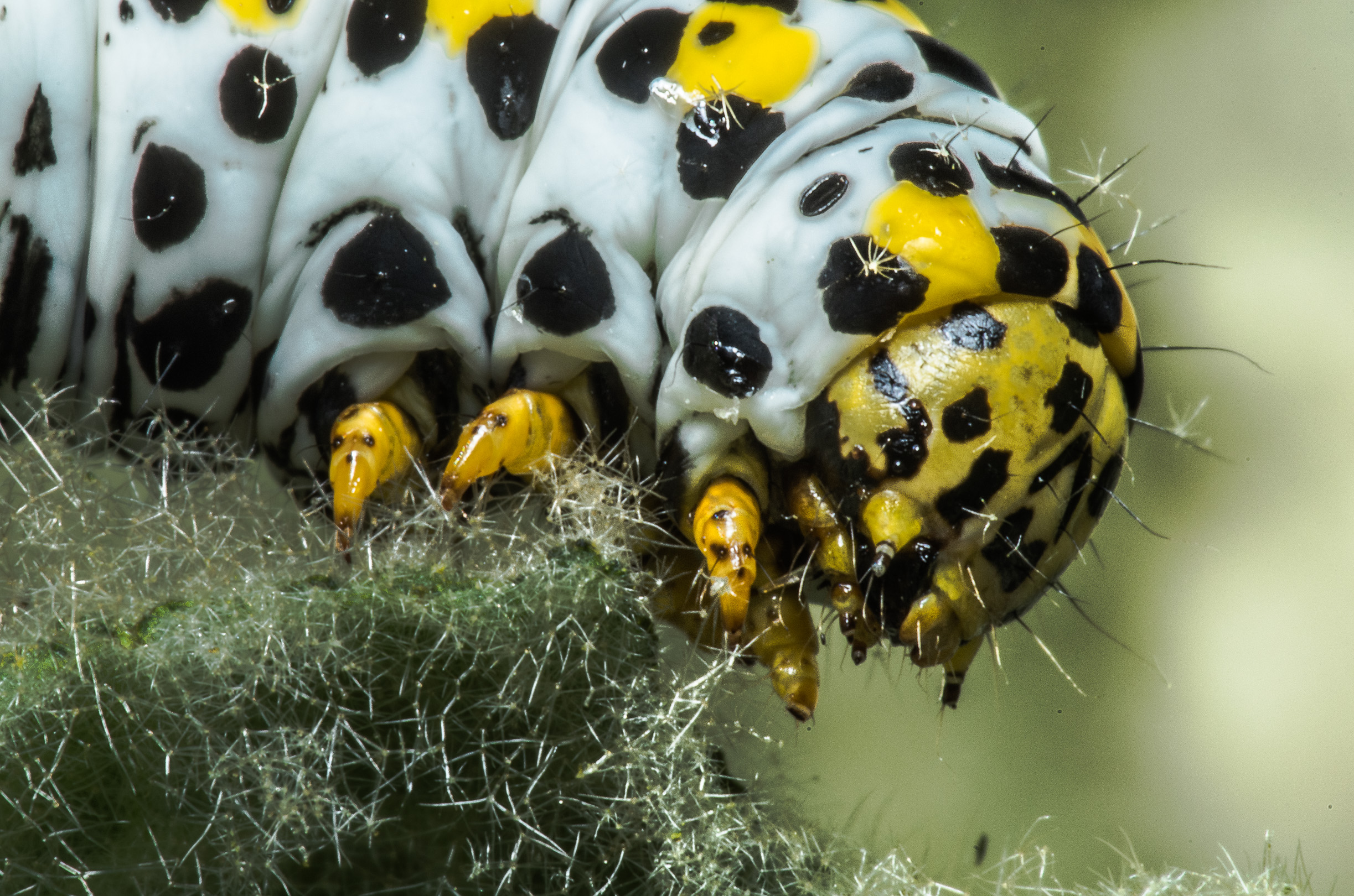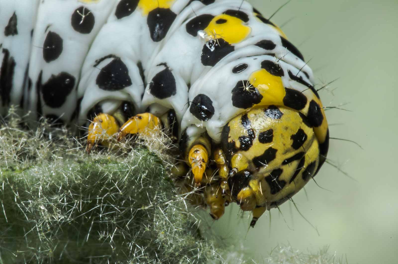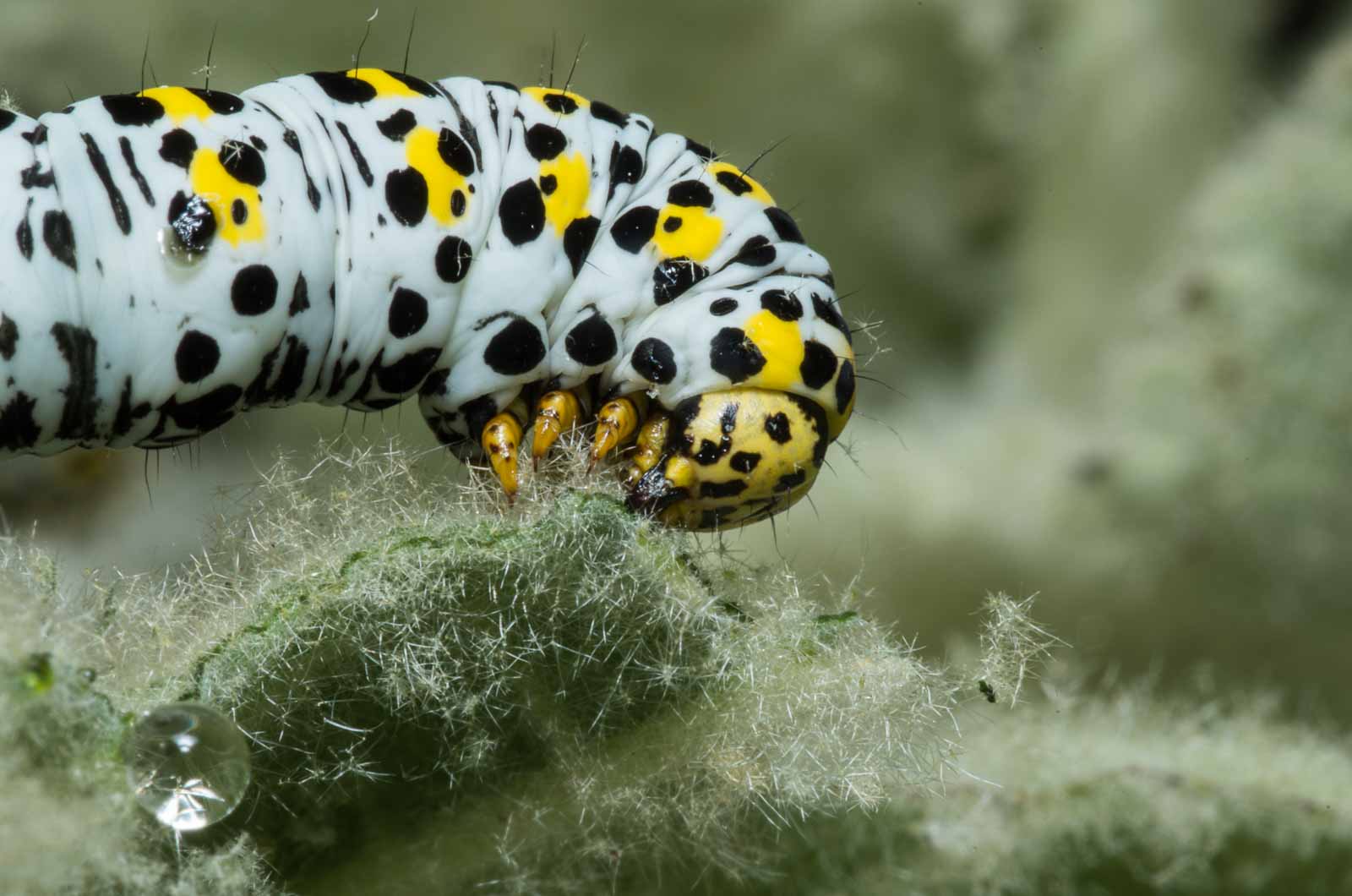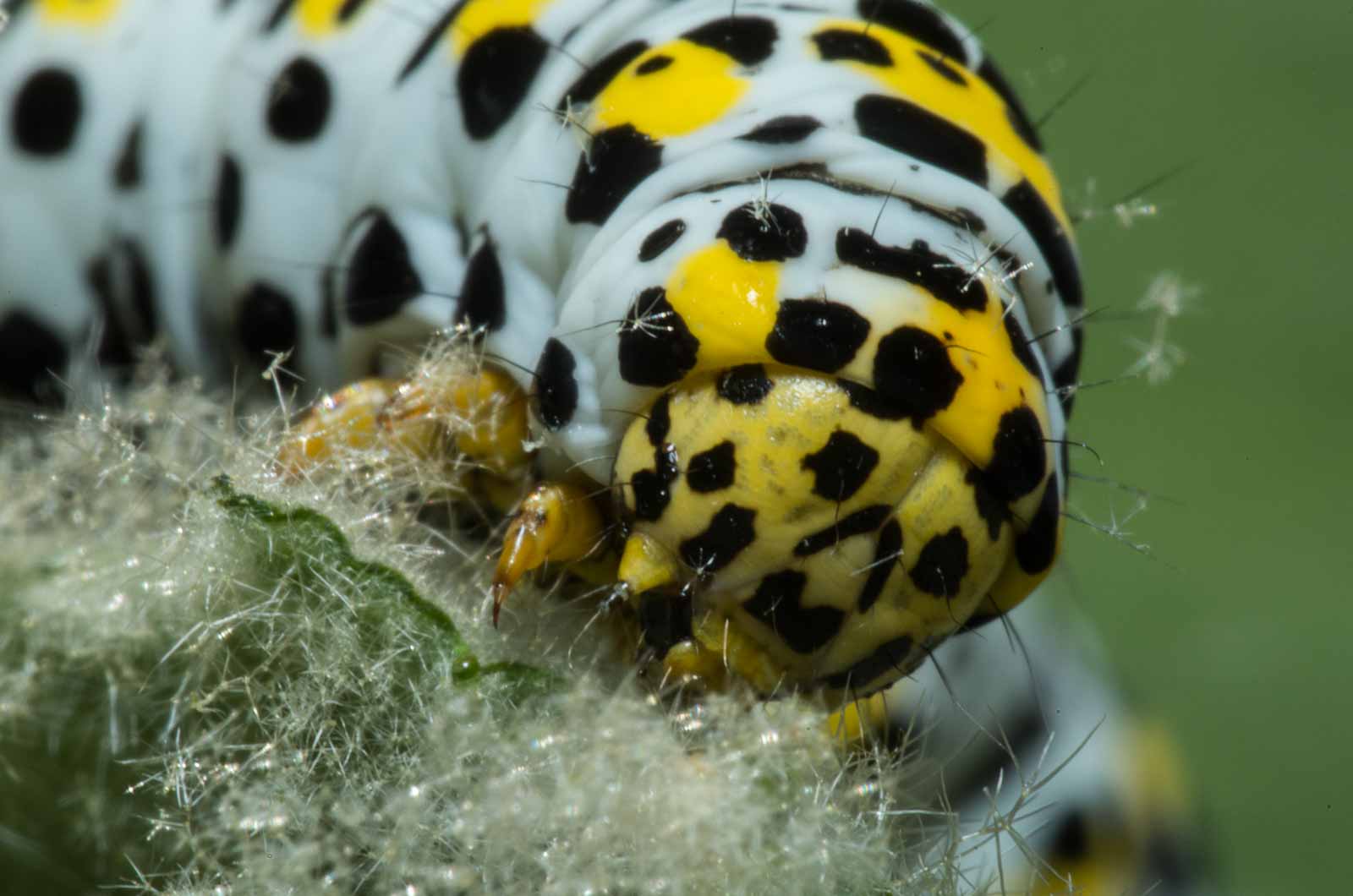 Erwachsene Raupen haben eine rein weiße, gelblichweiße oder grünlichweiße Grundfärbung. Auf jedem Segment befindet sich eine leuchtend gelbe, manchmal auch in einzelne Flecke aufgelöste Querbinde. An den Seiten und auf dem Rücken zeigt sich eine Vielzahl schwarzer Flecke und Striche. Diese sind etwas kleiner als bei der sehr ähnlichen Raupe vom Braunwurz-Mönch, die meist auch eine leicht bläulichweiße Grundfarbe aufweist. Am Körper befinden sich einige kurze, dünne Haare. Der Kopf ist groß, gelb und zeigt ein markantes schwarzes Fleckenmuster.
