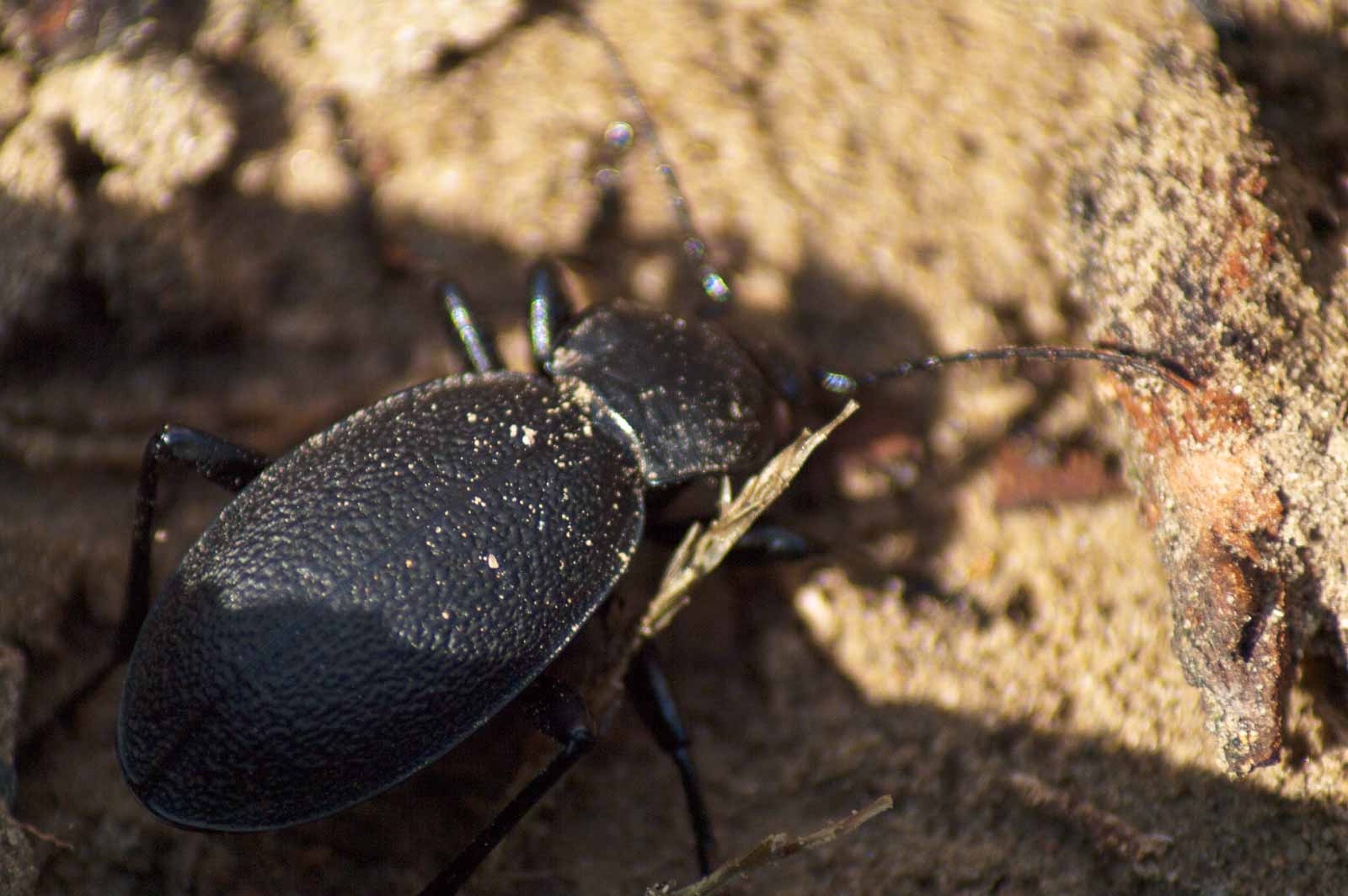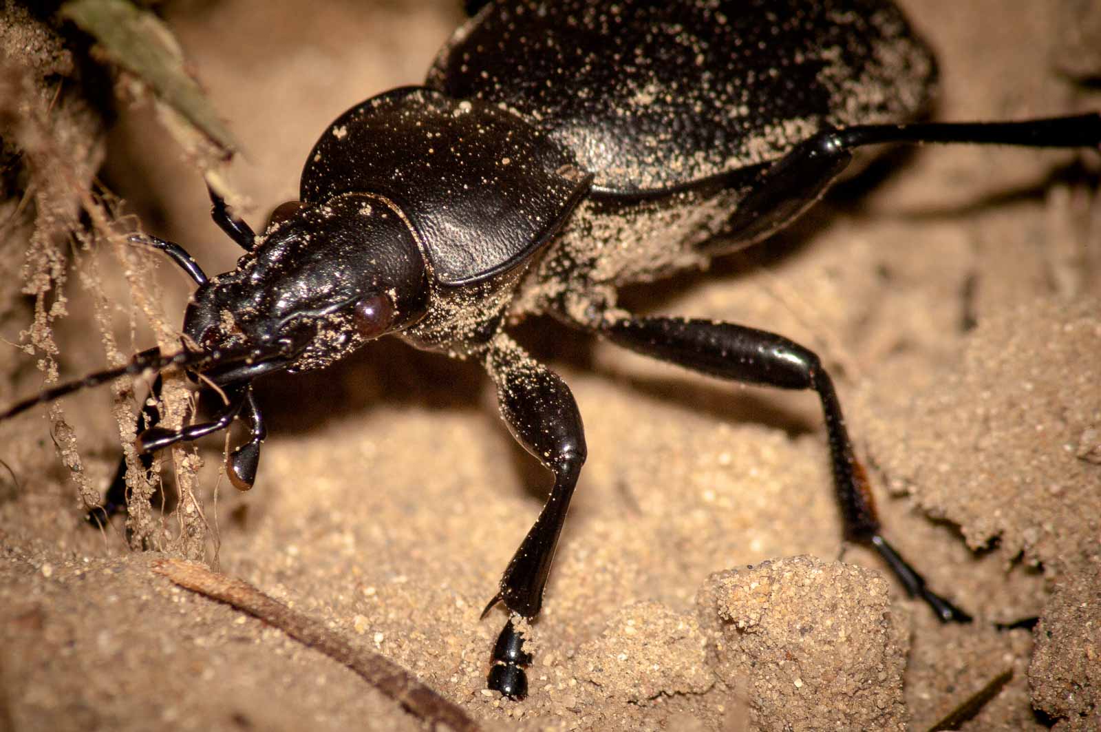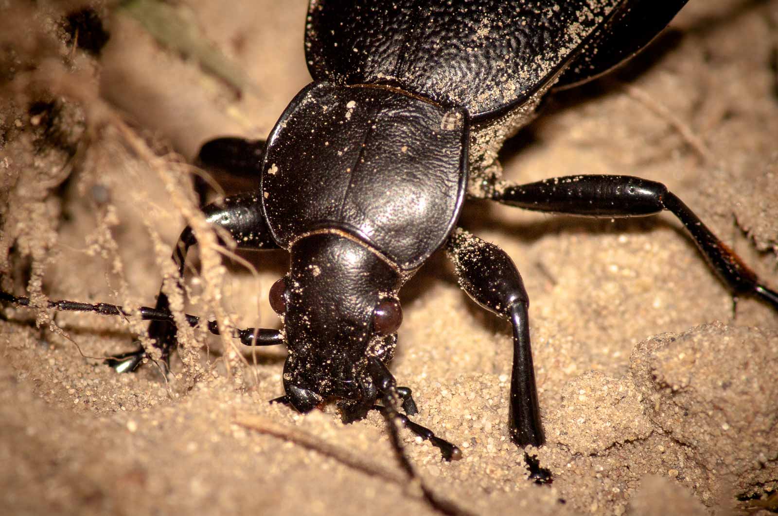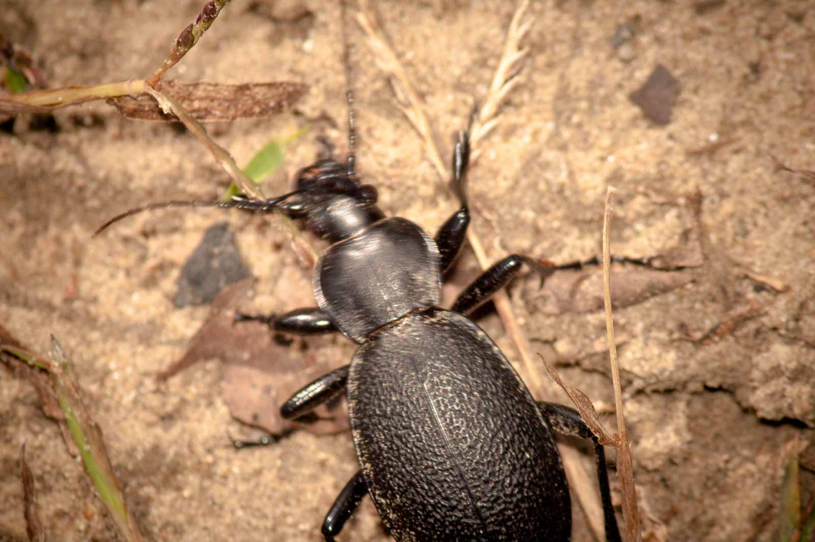 Als eine der größten Laufkäferarten Mitteleuropas kann der Lederlaufkäfer 30 bis 40 Millimeter lang werden. Der Chitin-Panzer ist schwarz und an den Flügeldecken gerunzelt. Auffällig sind die großen Oberkieferzangen. Am mittleren Beinpaar sind ein paar rostfarbene Borsten zu erkennen.