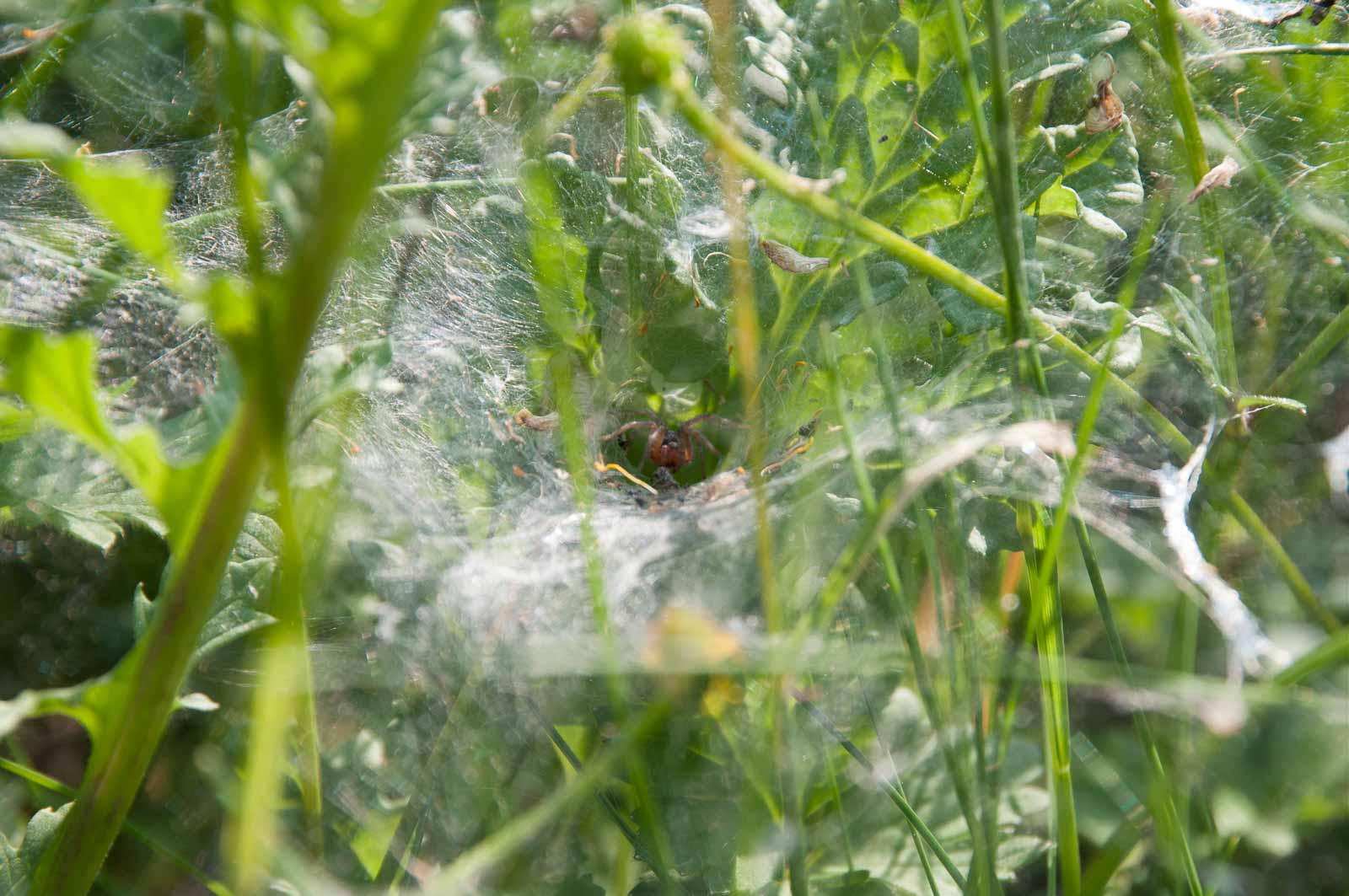 Damit der Nachwuchs im ersten Stadium den Kokon verlassen kann, baut das Weibchen das Glockengewebe in den frühen Morgenstunden zu einer Kinderstube um. Dazu macht es zunächst den inzwischen stark aufgeweiteten Kokon am Dach des Gespinstes fest. Dann reißt es ihn mit den Cheliceren fast vollständig auf und zieht Fäden vom Glockengewebe aus in die umgebende Krautvegetation. Nachdem es so ein zeltartiges Gespinst, das Kinderstubennetz, geschaffen hat, wird es in der Zeit von zwei bis drei Stunden nach Öffnung des Kokons durch das Weibchen von den Jungen besiedelt. Die Mutter hängt meist kopfunter außen auf dem Kinderstubengespinst, um die Jungen zu bewachen. Bei Regen verstärkt sie das Netz der Kinderstube und repariert aufgetretene Schäden. Bei starker Störung flieht sie, indem sie um das Netz herumläuft oder in die Vegetation unterhalb des Netzes verschwindet. Die Mutter kehrt jedoch bald wieder zu ihren Jungen zurück.