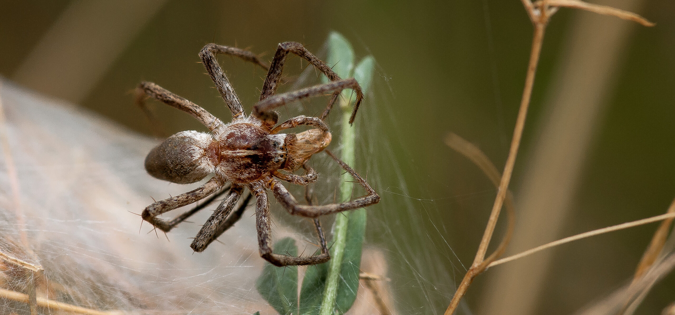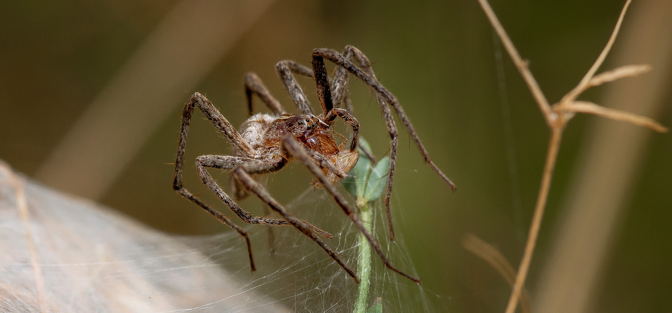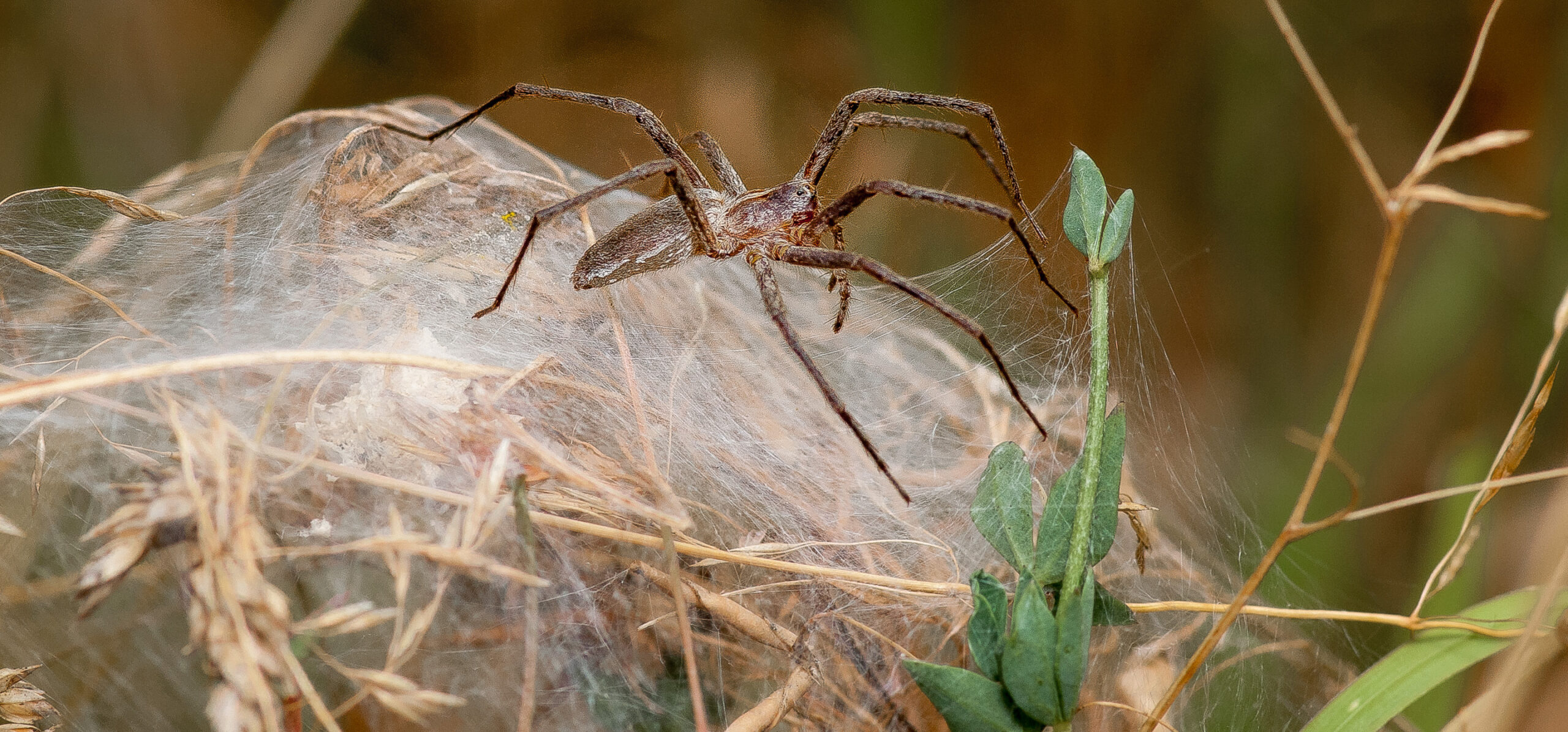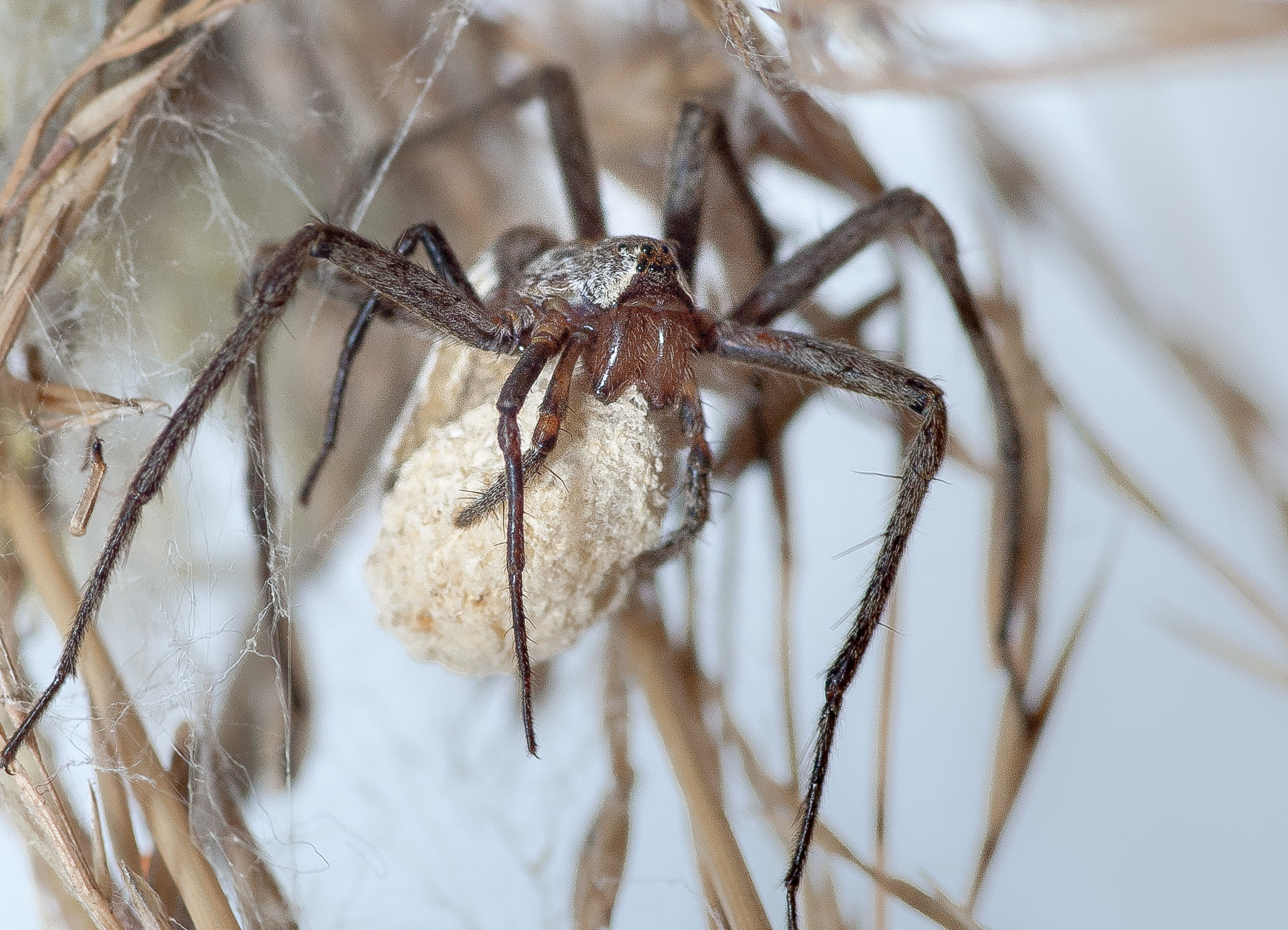 Die erste Eiablage erfolgt zwischen dem 13. und dem 91. Tag nach der Adulthäutung. Die befruchteten Eier messen fast ein Millimeter Durchmesser und sind hell, kugelrund und weich. Nicht entwickelte Eier sind dunkelbraun, eingeschrumpft und hart. Zwei bis drei Tage vor dem Schlüpfen der Jungtiere gegen Ende der Nacht wird zwischen Pflanzenstängeln ein Glockengewebe gewebt. Dieses unten offene, meist fünf Zentimeter hohe, drei Zentimeter weite, am Dach am dichtesten gesponnene Gespinst wird in höchstens ein Meter Höhe befestigt. Während des Spinnens heftet das Weibchen den Eikokon an eine Unterlage und nimmt ihn von Zeit zu Zeit in die Cheliceren. Zum Schluss wird der Kokon im Glockengewebe aufgehängt. Die geschlüpften Jungen werden von der Mutter bewacht und vor allem vor anderen Spinnen verteidigt.