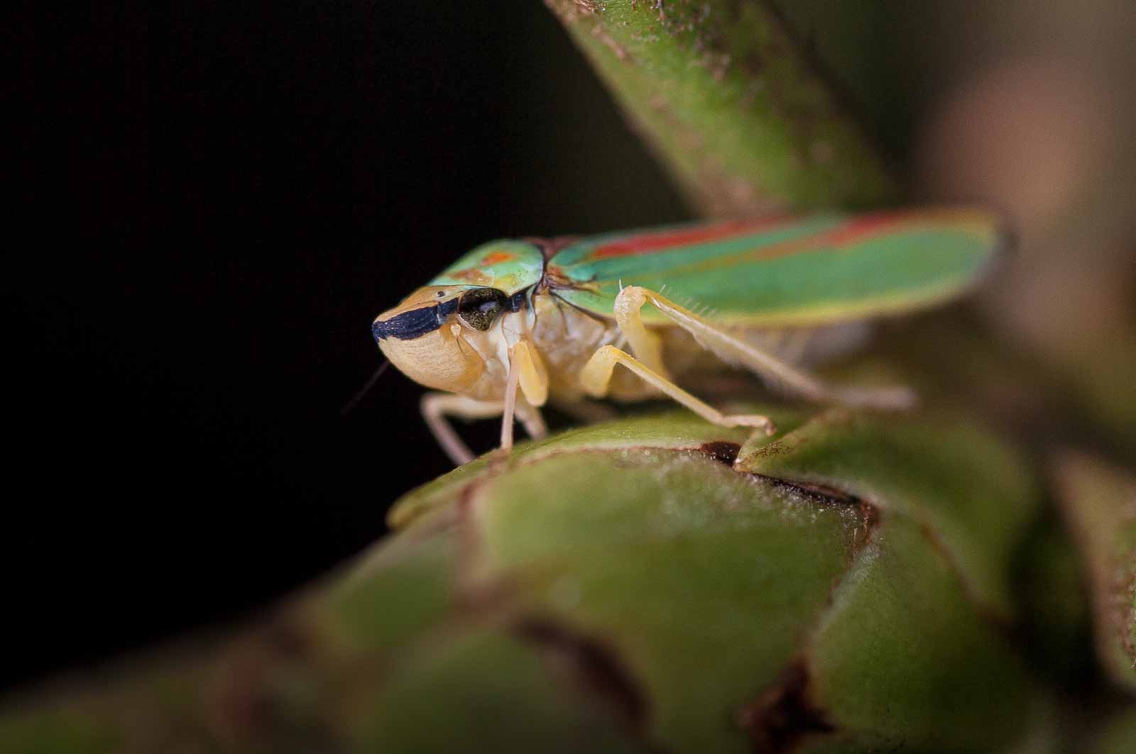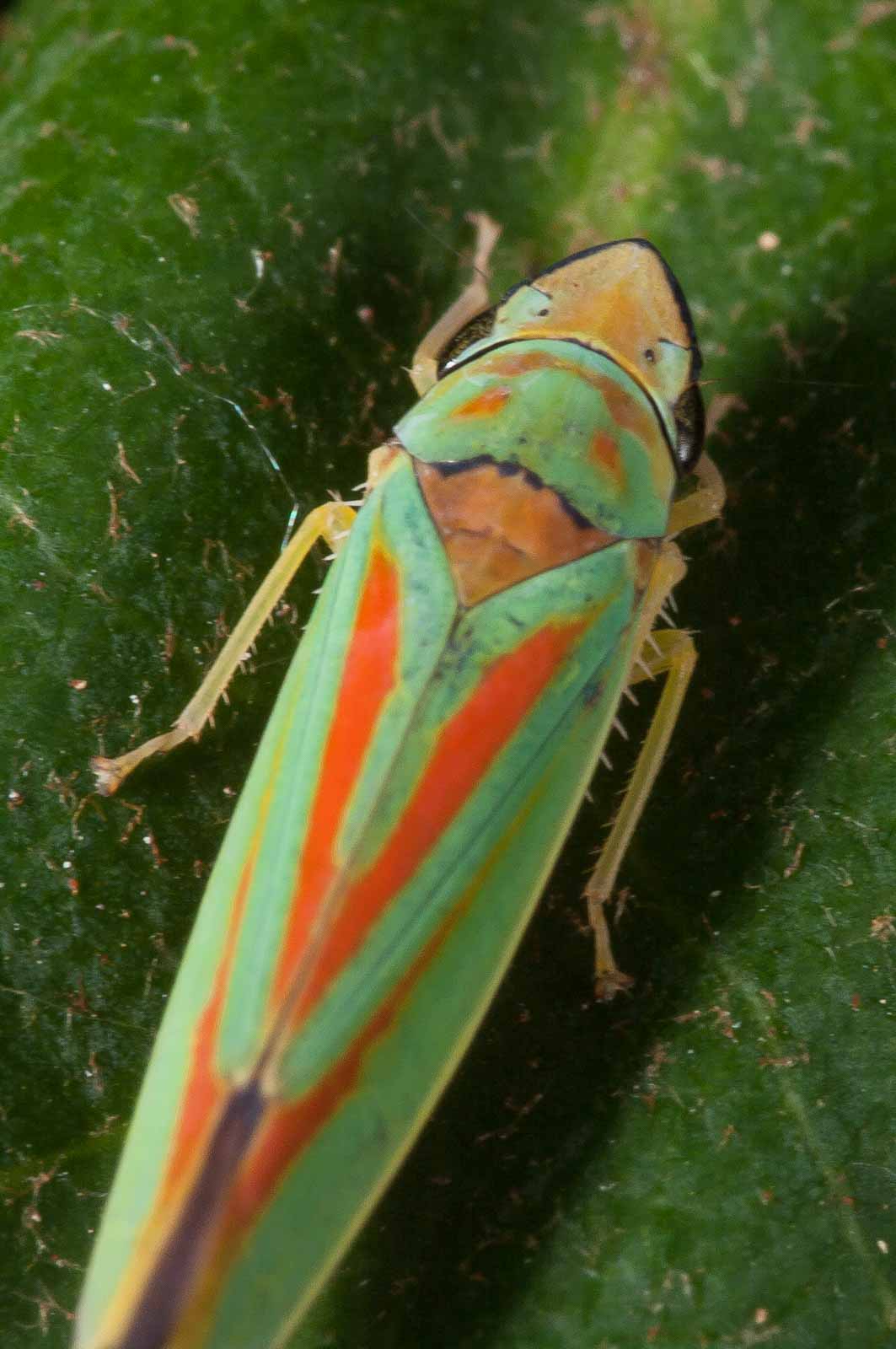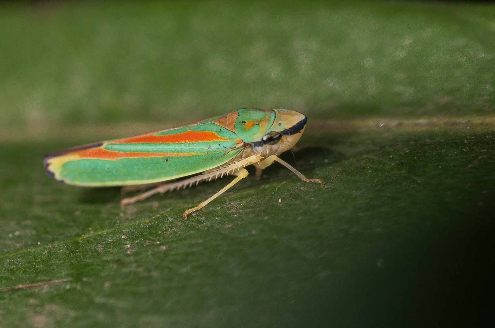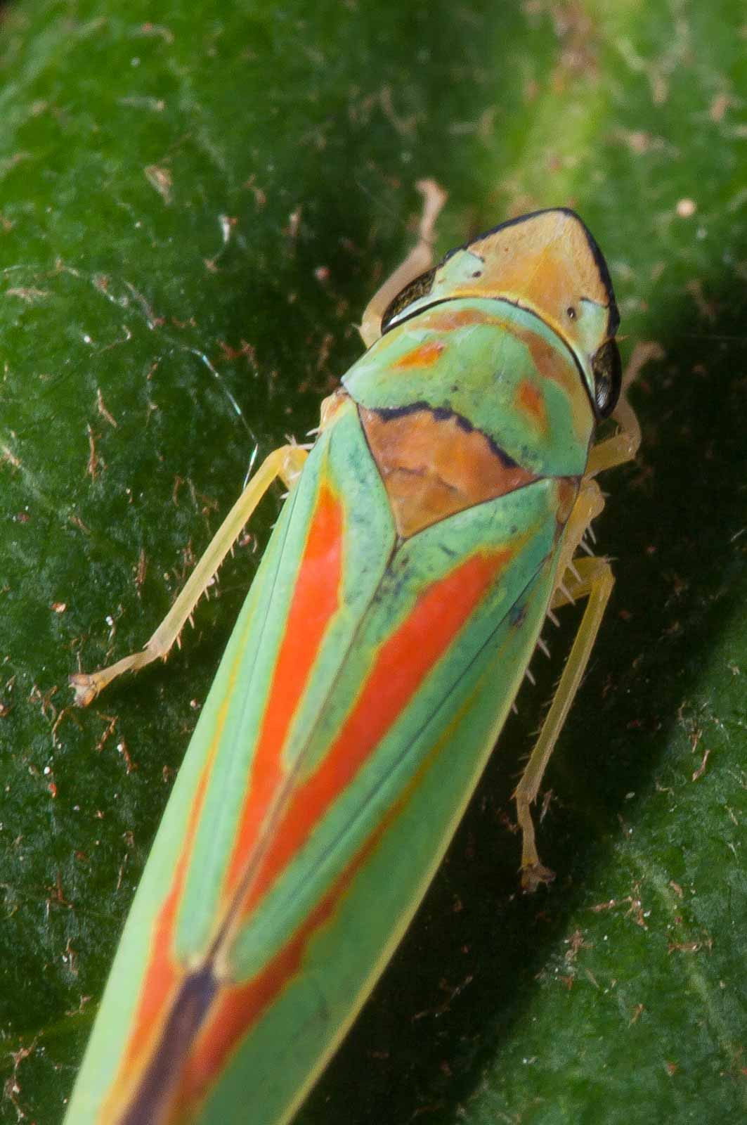 Die Zikaden erreichen eine Körperlänge von acht bis neun Millimetern. Ihre für mitteleuropäische Arten unverwechselbare Körperfärbung ist sehr farbenfroh. Die Oberseite des Halsschildes und der Vorderflügel haben eine kräftig grüne Grundfarbe. Das Halsschild trägt mehrere, zum Teil ineinander fließende orange Flecken, die Vorderflügel weisen je zwei leicht schräg verlaufende orange Längslinien auf, die beide am Flügelinnenrand enden. Der Rand der Flügelspitze ist wie die Hinterflügel dunkel-violett gefärbt. Die Beine, der Hinterleib und der Kopf sind gelb gefärbt. Letzterer hat einen violett bis dunkel gefärbten Streifen auf der Stirn, der über die Facettenaugen bis unter den Rand des Halsschildes verläuft. Das Schildchen (Scutellum) ist orange.