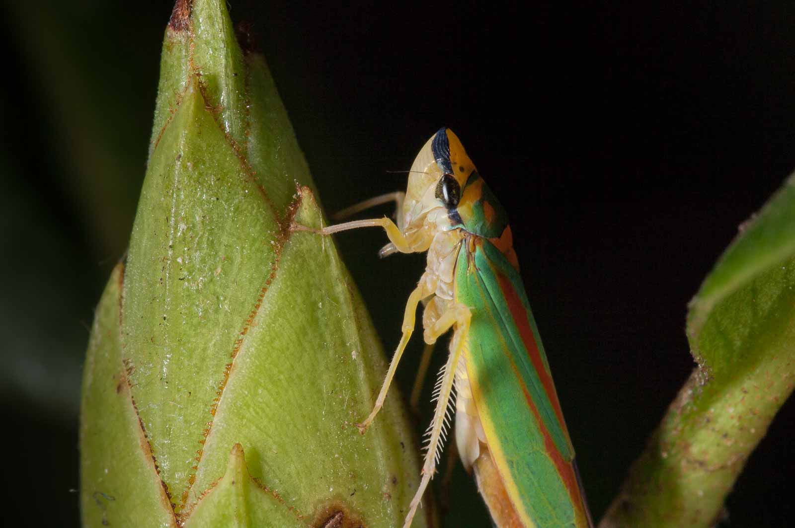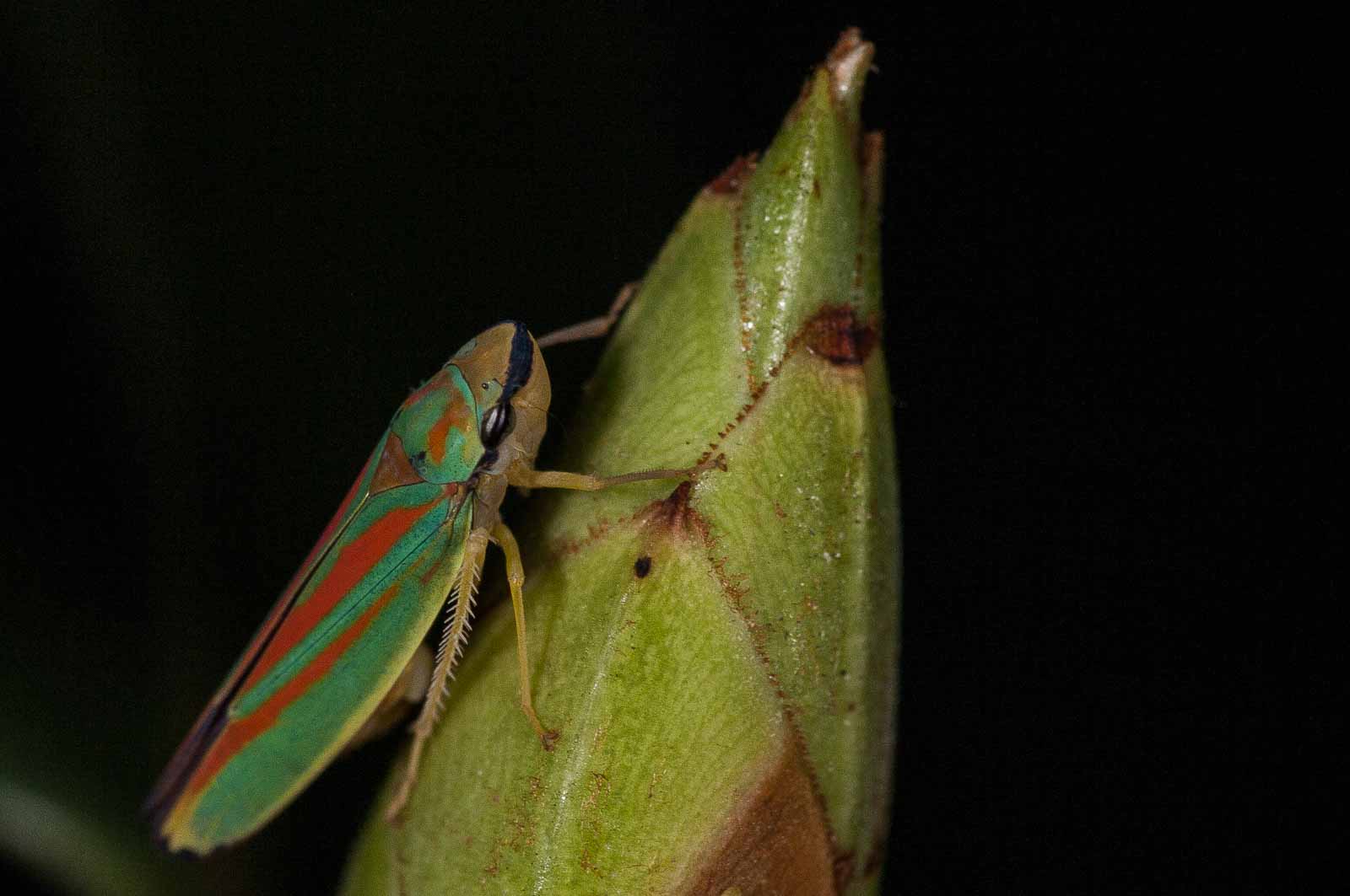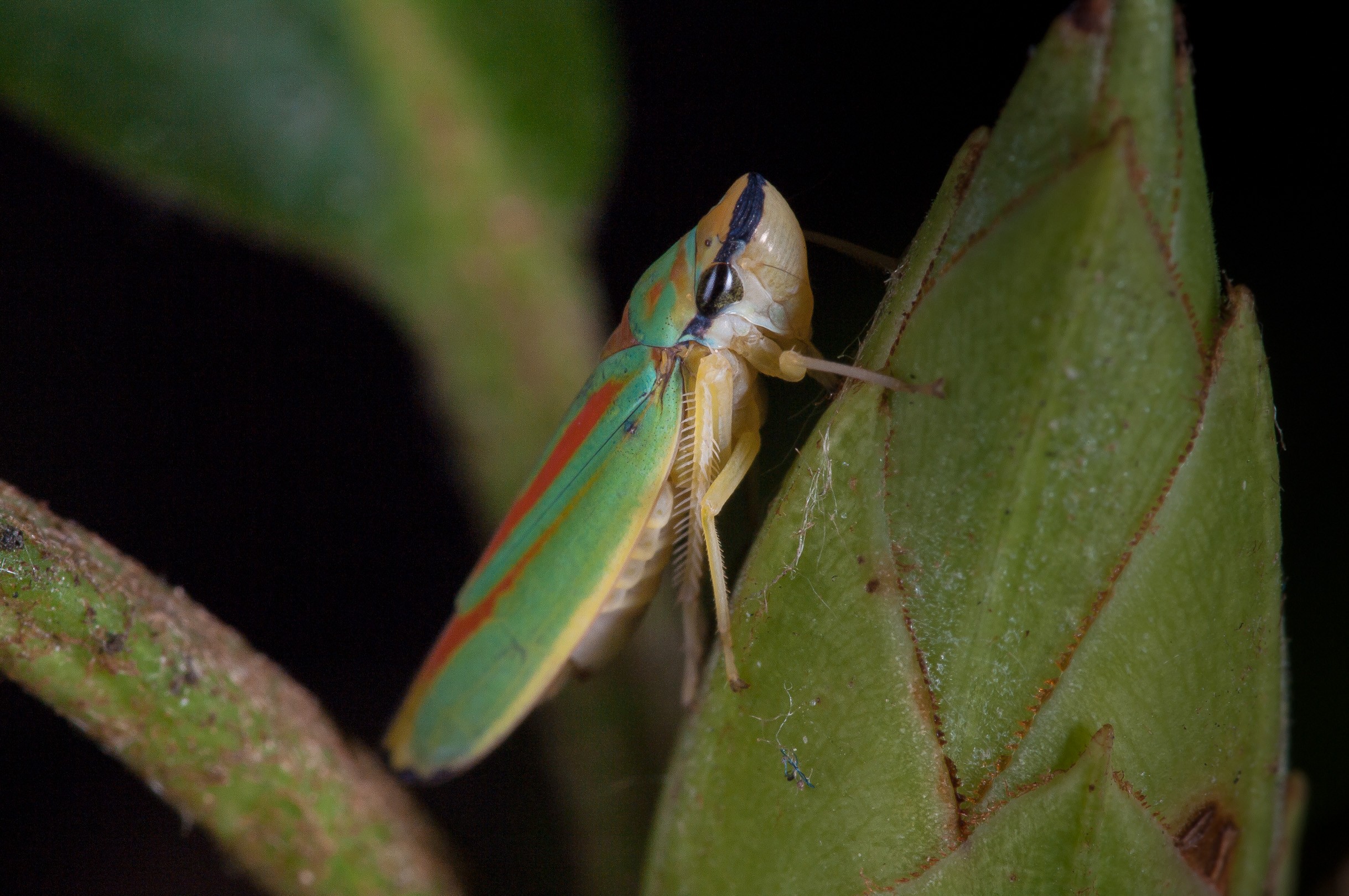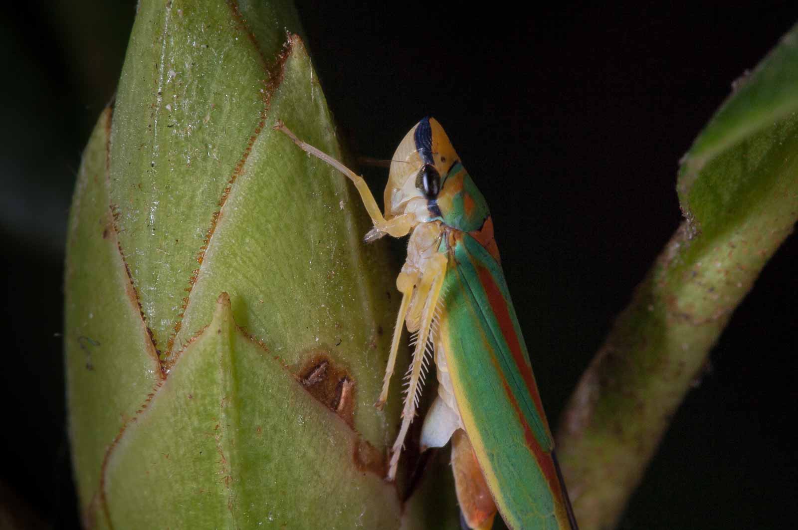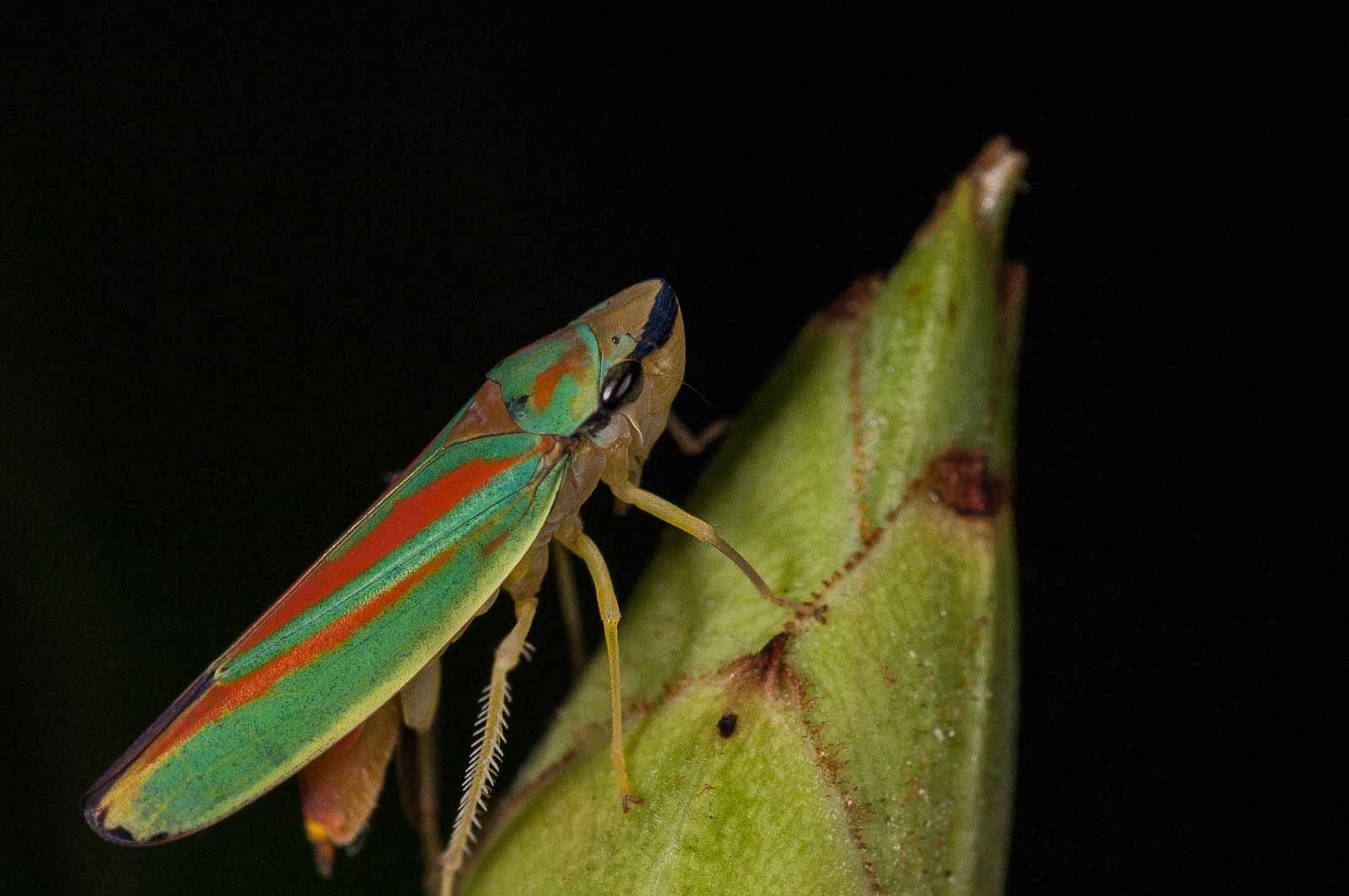 Die Zikaden erreichen eine Körperlänge von acht bis neun Millimetern. Ihre für mitteleuropäische Arten unverwechselbare Körperfärbung ist sehr farbenfroh. Die Oberseite des Halsschildes und der Vorderflügel haben eine kräftig grüne Grundfarbe. Das Halsschild trägt mehrere, zum Teil ineinander fließende orange Flecken, die Vorderflügel weisen je zwei leicht schräg verlaufende orange Längslinien auf, die beide am Flügelinnenrand enden. Der Rand der Flügelspitze ist wie die Hinterflügel dunkel-violett gefärbt. Die Beine, der Hinterleib und der Kopf sind gelb gefärbt. Letzterer hat einen violett bis dunkel gefärbten Streifen auf der Stirn, der über die Facettenaugen bis unter den Rand des Halsschildes verläuft. Das Schildchen (Scutellum) ist orange.