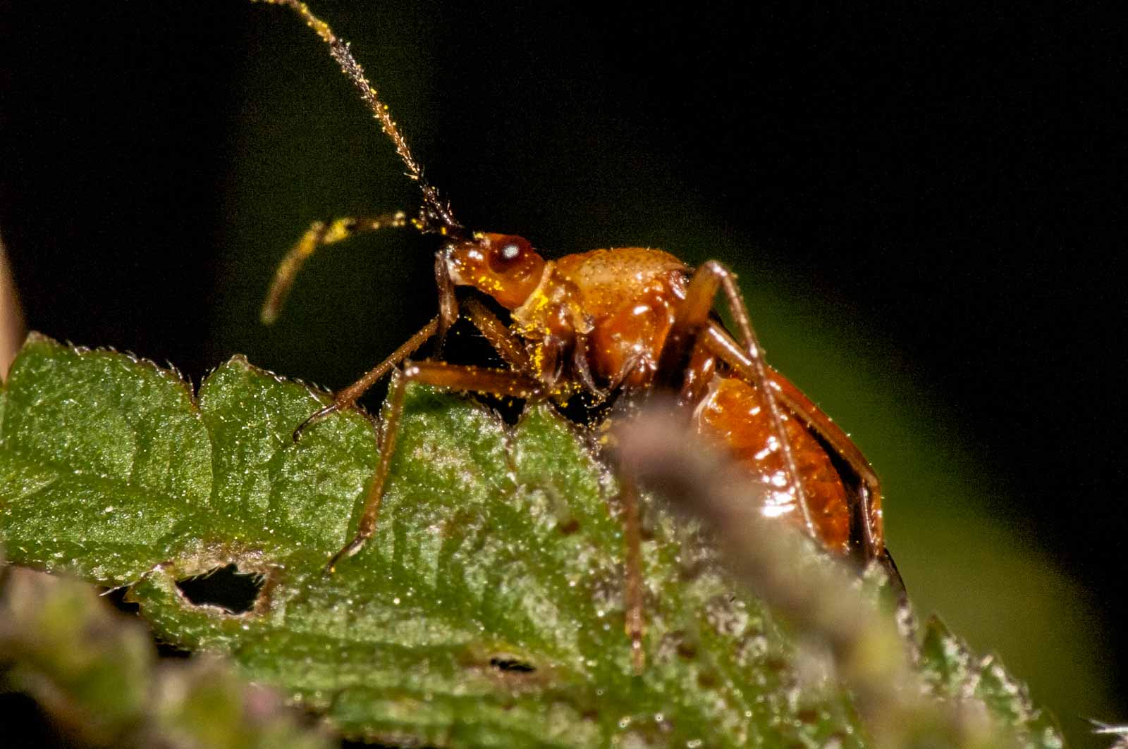 Die Tiere werden 6,6 bis 7,7 Millimeter lang. Ihre Grundfarbe variiert von rot-orange bis nahezu vollständig schwarz. In der Regel ist der Cuneus der Hemielytren mehr oder weniger stark rot gefärbt. Die Männchen sind dunkler gefärbt, als die Weibchen.