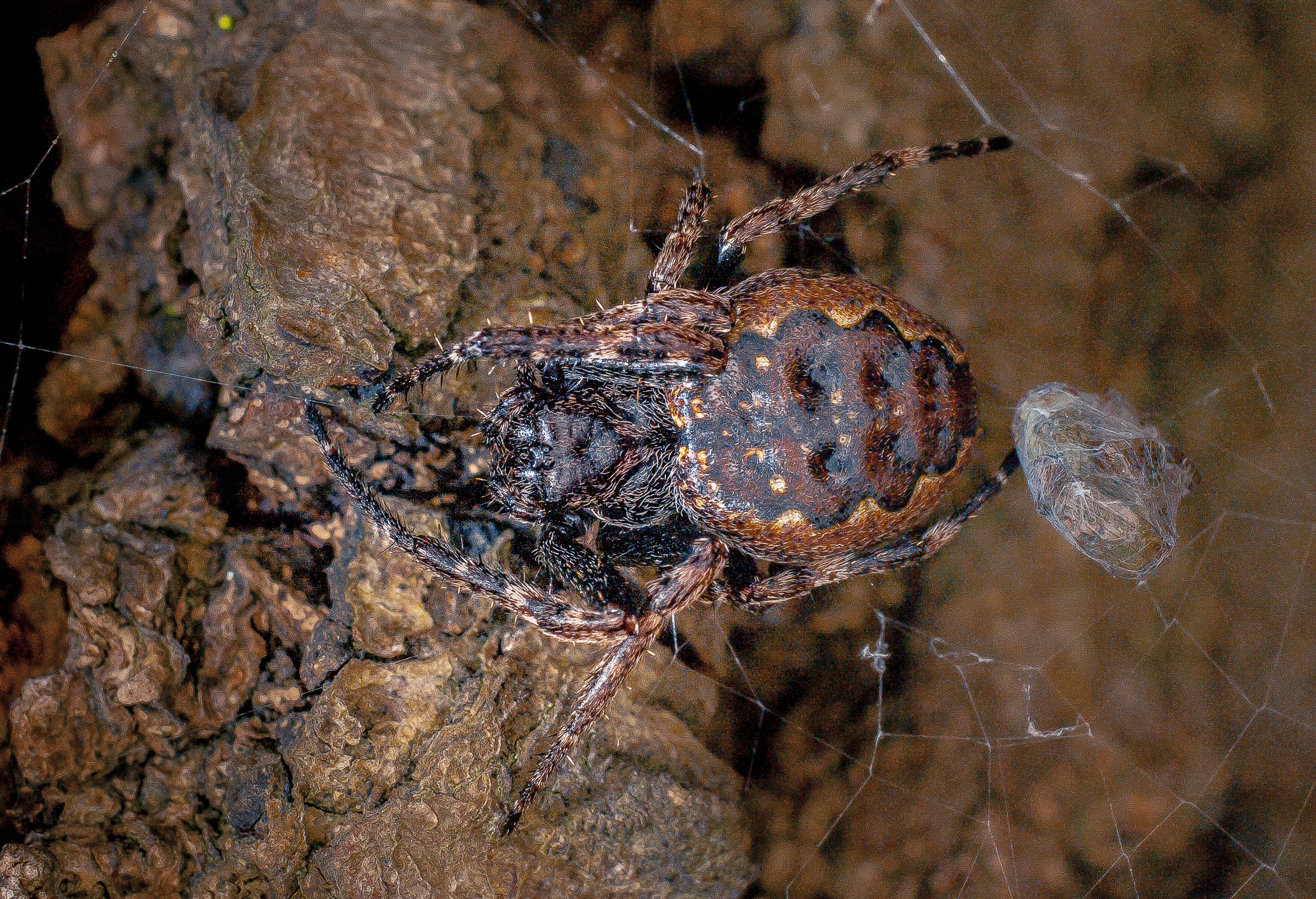 Der Hinterkörper (Opisthosoma) ist, im Gegensatz zu den meisten anderen mitteleuropäischen Vertretern der Familie, dorsoventral stark abgeflacht. Auf der Oberseite sind relativ sehr große, paarige Vertiefungenerkennbar, an denen im Körperinneren Muskeln ansetzen, mit denen die Spinne den Hinterkörper noch weiter abflachen kann. Die Grundfärbung variiert von rotbraun bis schwarzbraun mit einer dunklen, gelblich bis gelbgrünlich eingefassten, blattförmigen Zeichnung. Die Schenkel sind fast einfarbig dunkelbraun, die äußeren Beinglieder sind deutlich hellbraun/dunkelbraun geringelt.