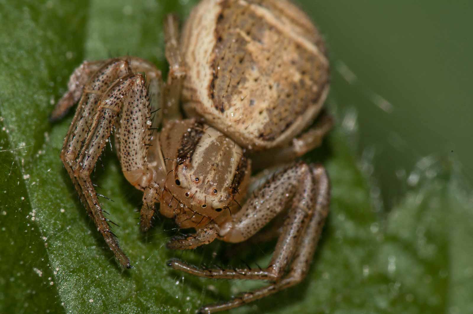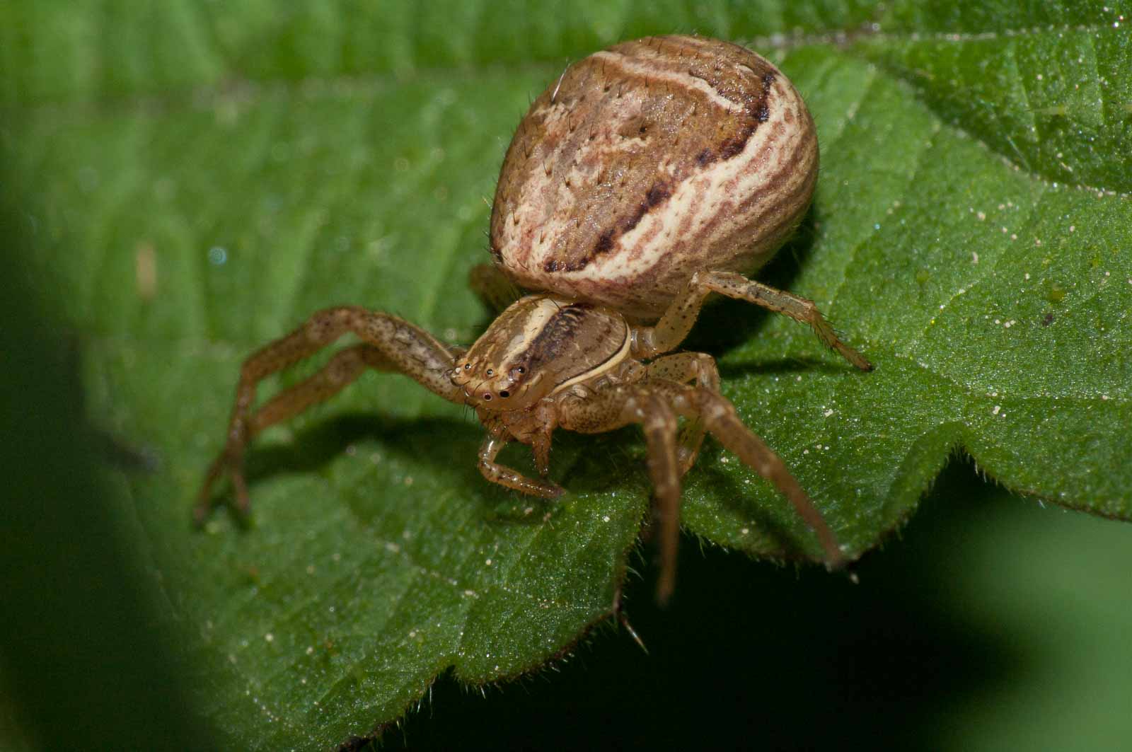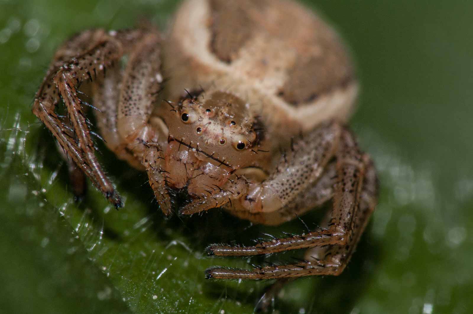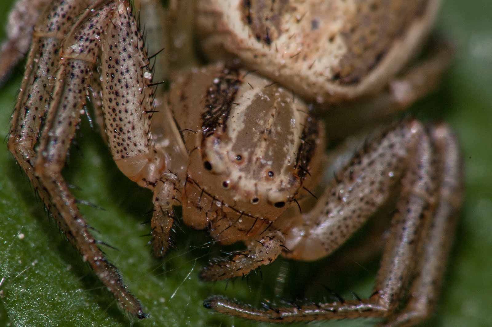 Der Vorderkörper (Prosoma) des Weibchens ist oberseits seitlich dunkelbraun, in der Mitte befindet sich ein breites, hell bräunliches bis blassgelbes Längsband, das einen vorne breiten und nach hinten spitz zulaufenden, also etwa V-förmigen, braunen Fleck umrandet. Der Hinterkörper (Opisthosoma) zeigt auf ebenfalls hellerem Grund eine bräunliche vorne unterbrochene Blattzeichnung und auf dieser hinten drei helle Querbänder. Die Beine sind recht einfarbig hellbeige bis braun und intensiv fein dunkel gefleckt.