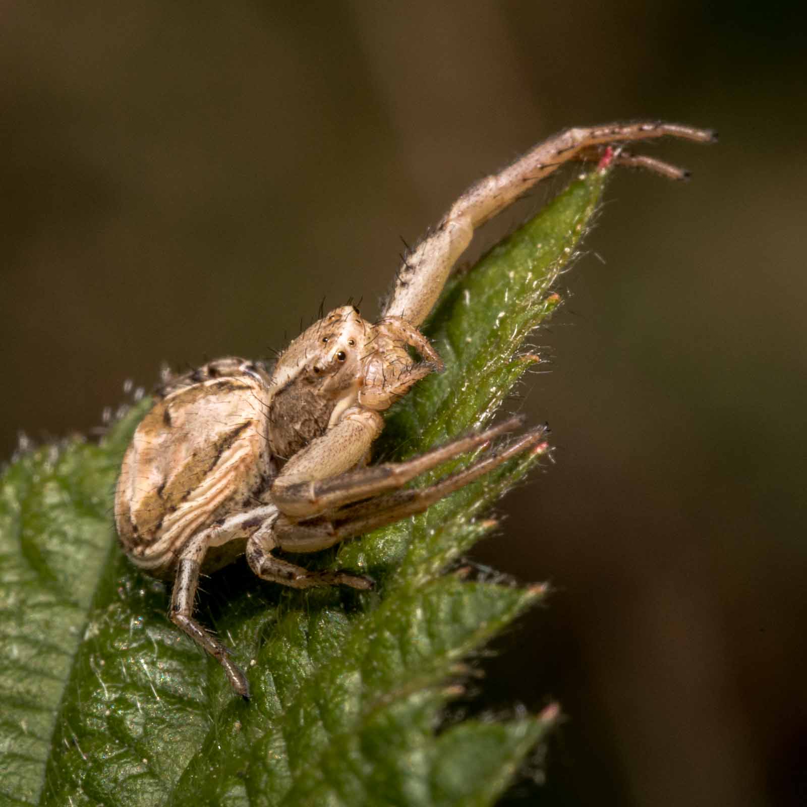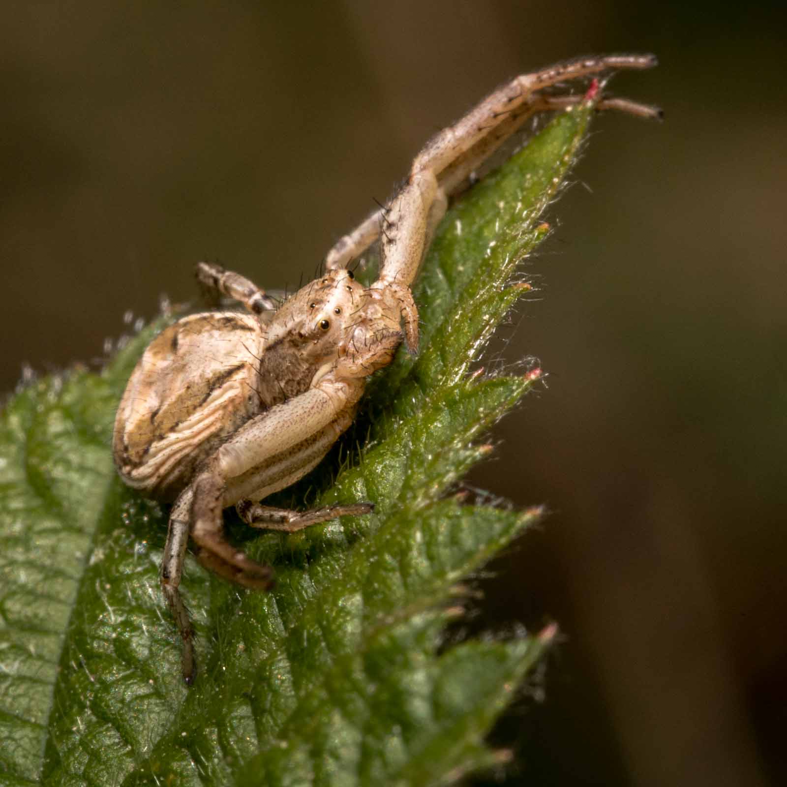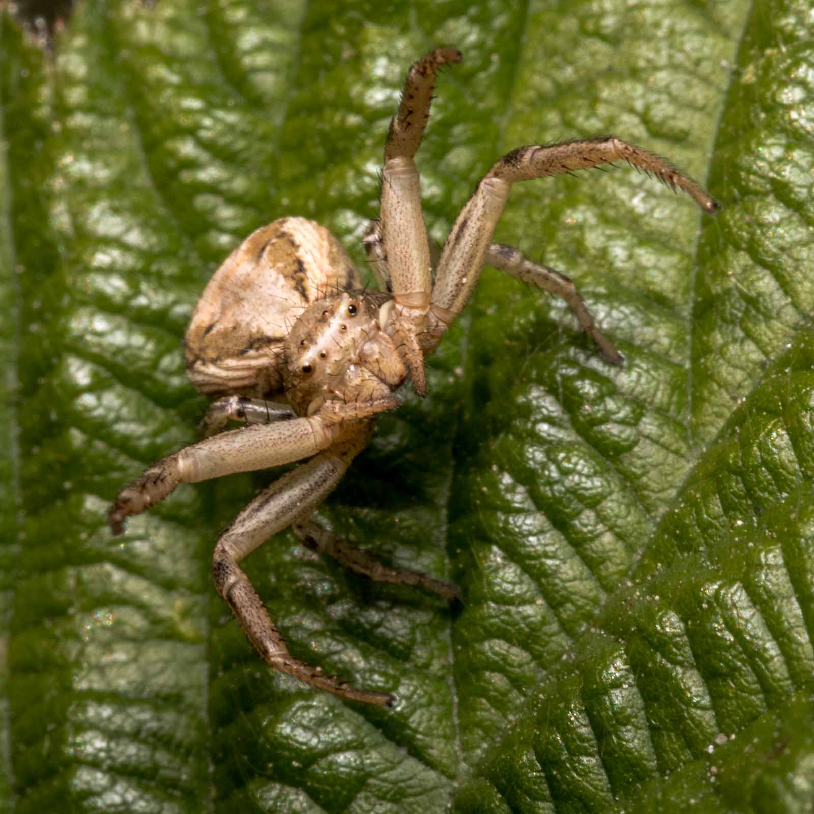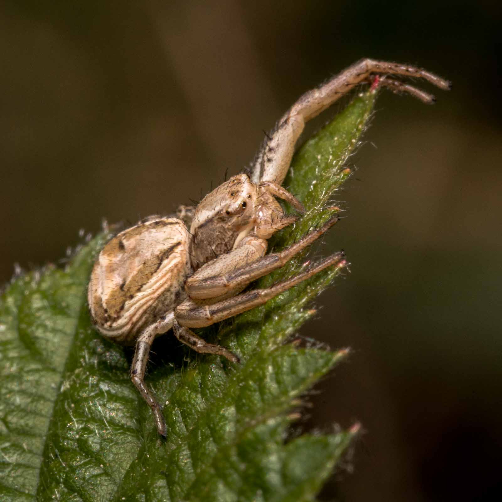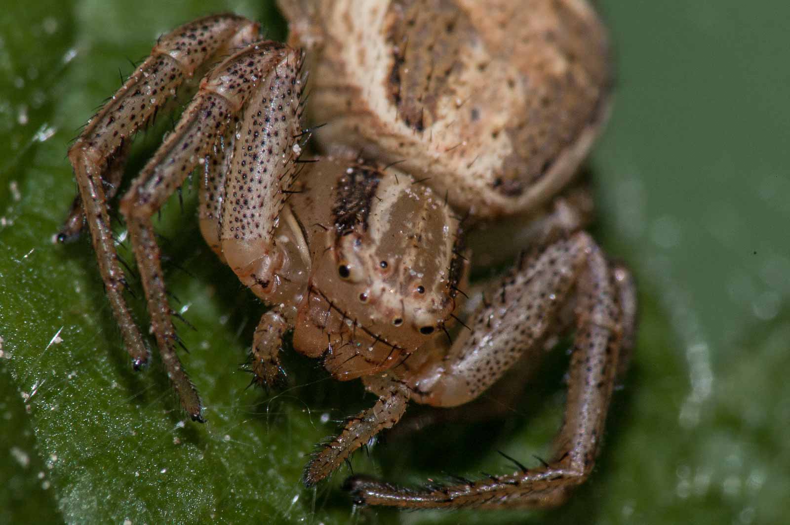 Der Vorderkörper (Prosoma) des Weibchens ist oberseits seitlich dunkelbraun, in der Mitte befindet sich ein breites, hell bräunliches bis blassgelbes Längsband, das einen vorne breiten und nach hinten spitz zulaufenden, also etwa V-förmigen, braunen Fleck umrandet. Der Hinterkörper (Opisthosoma) zeigt auf ebenfalls hellerem Grund eine bräunliche vorne unterbrochene Blattzeichnung und auf dieser hinten drei helle Querbänder. Die Beine sind recht einfarbig hellbeige bis braun und intensiv fein dunkel gefleckt.