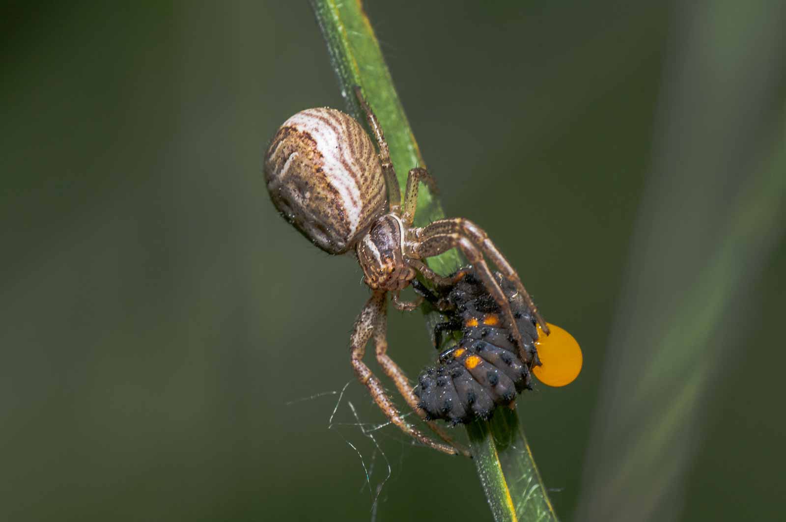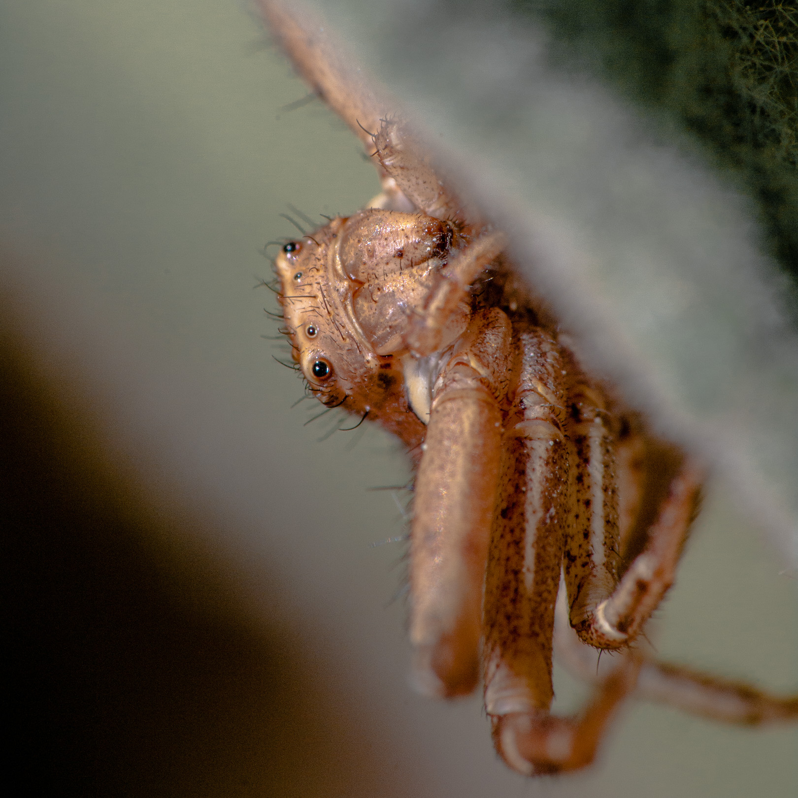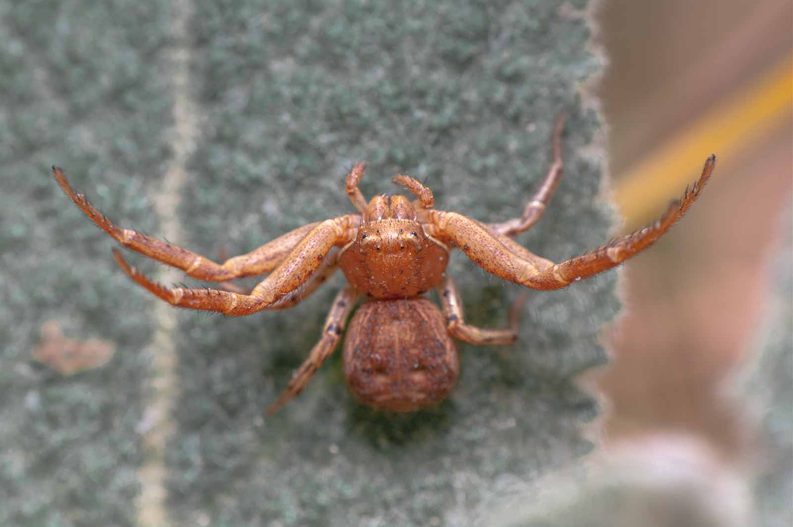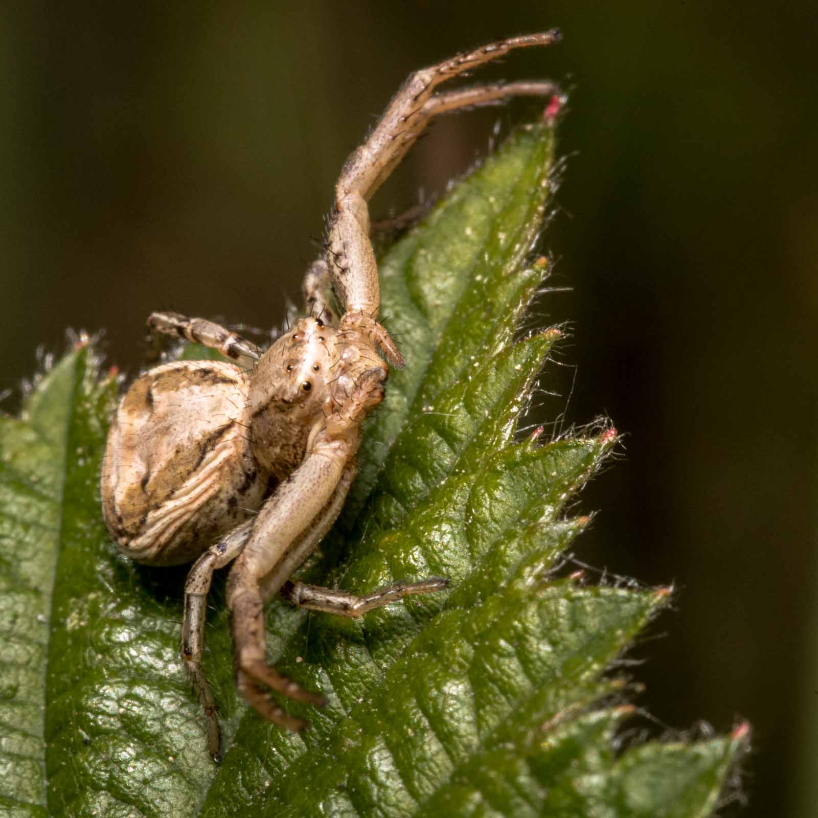 Der Vorderkörper (Prosoma) des Weibchens ist oberseits seitlich dunkelbraun, in der Mitte befindet sich ein breites, hell bräunliches bis blassgelbes Längsband, das einen vorne breiten und nach hinten spitz zulaufenden, also etwa V-förmigen, braunen Fleck umrandet. Der Hinterkörper (Opisthosoma) zeigt auf ebenfalls hellerem Grund eine bräunliche vorne unterbrochene Blattzeichnung und auf dieser hinten drei helle Querbänder. Die Beine sind recht einfarbig hellbeige bis braun und intensiv fein dunkel gefleckt.