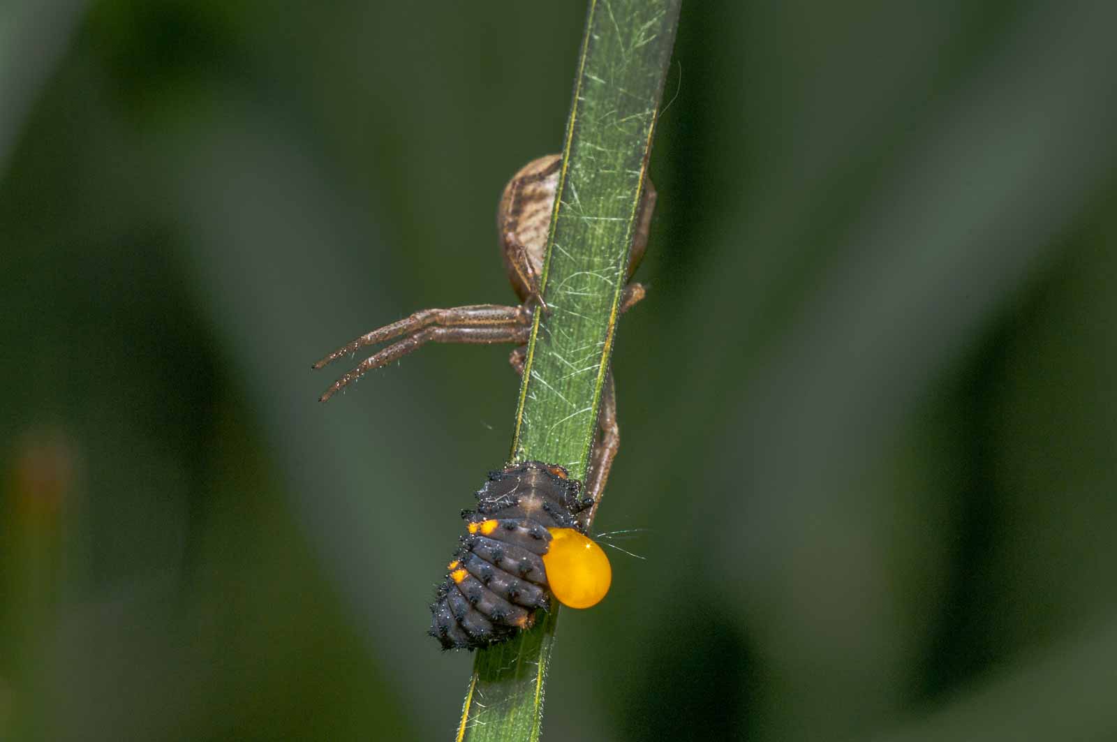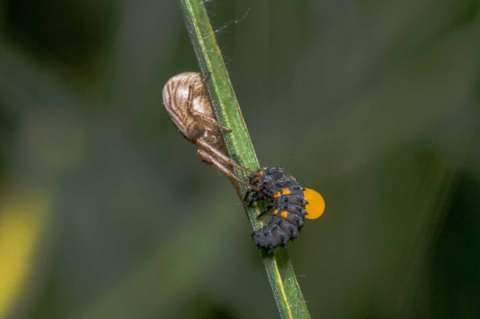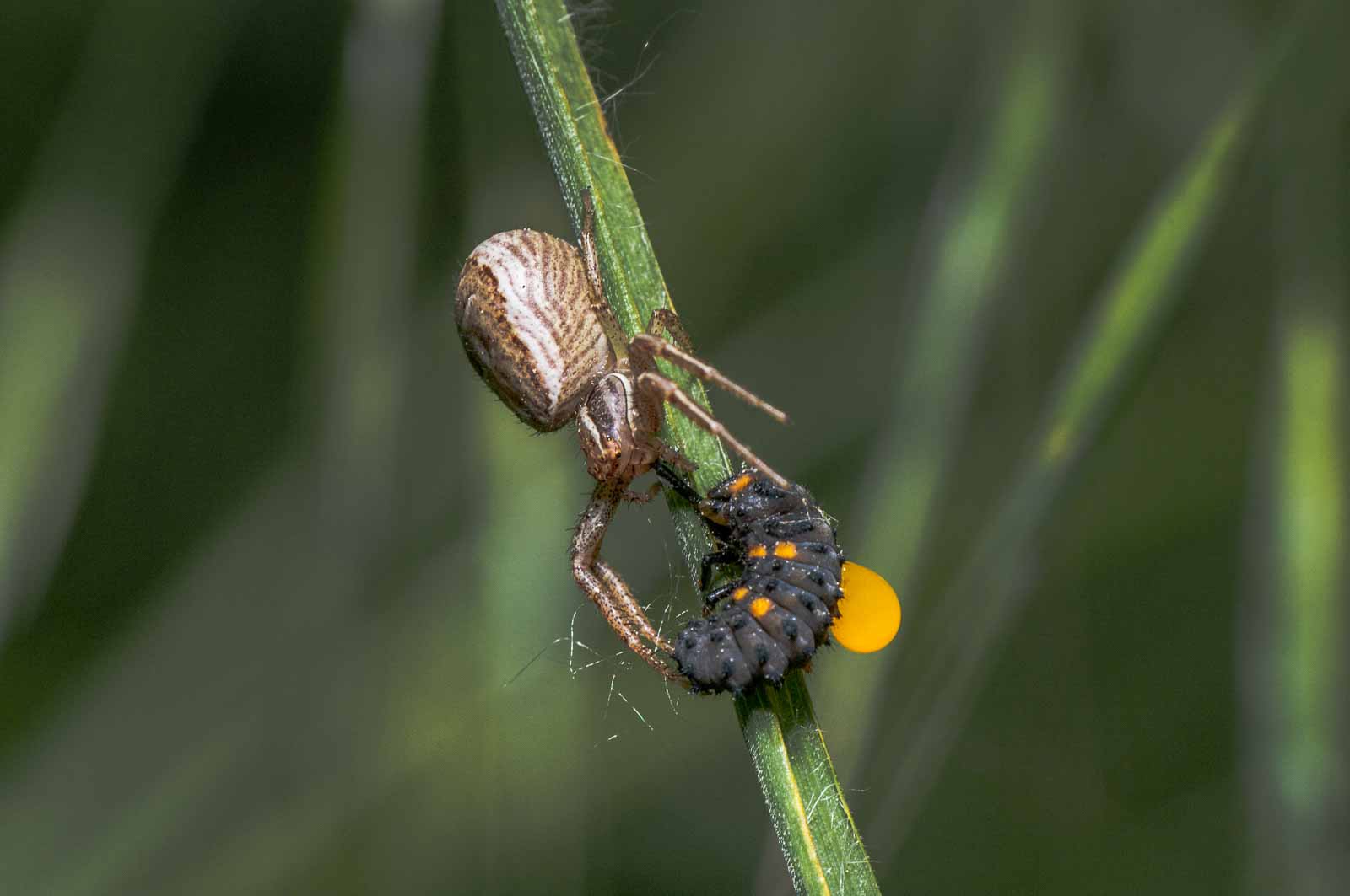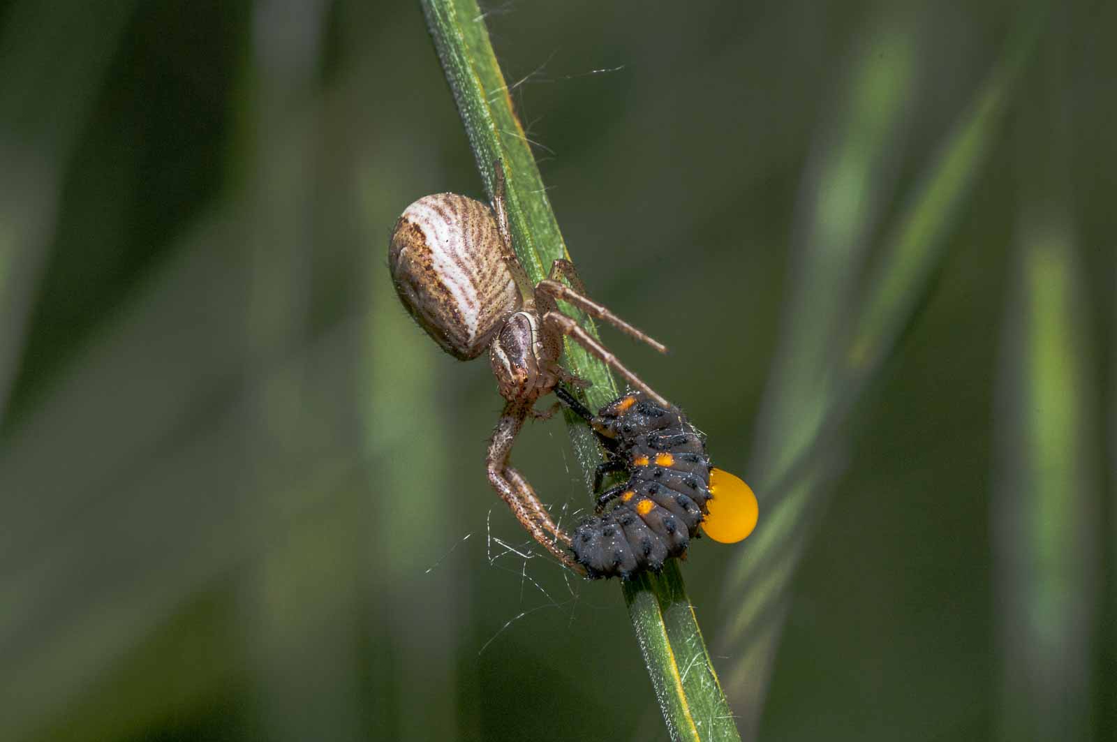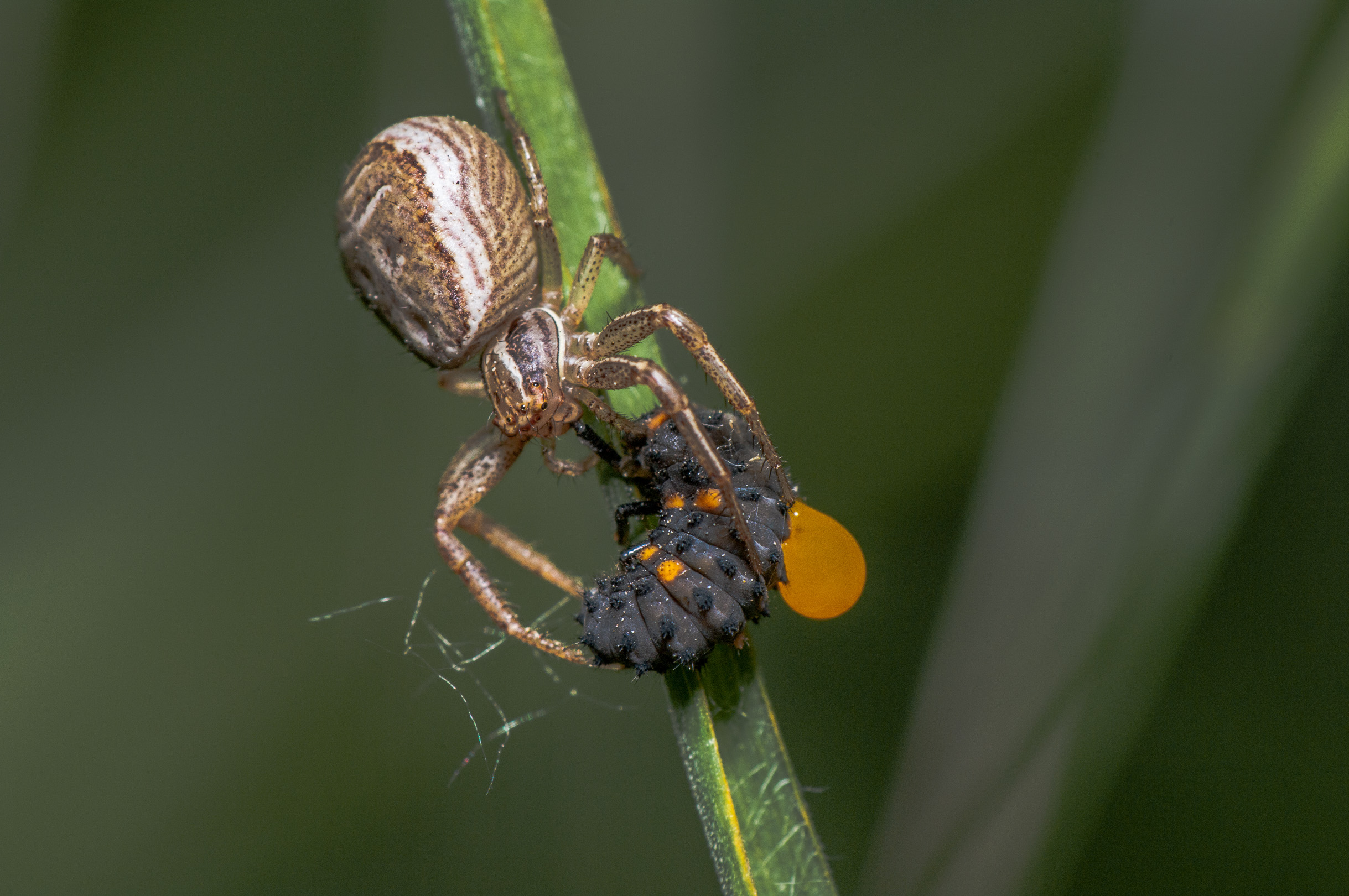 Der Vorderkörper (Prosoma) des Weibchens ist oberseits seitlich dunkelbraun, in der Mitte befindet sich ein breites, hell bräunliches bis blassgelbes Längsband, das einen vorne breiten und nach hinten spitz zulaufenden, also etwa V-förmigen, braunen Fleck umrandet. Der Hinterkörper (Opisthosoma) zeigt auf ebenfalls hellerem Grund eine bräunliche vorne unterbrochene Blattzeichnung und auf dieser hinten drei helle Querbänder. Die Beine sind recht einfarbig hellbeige bis braun und intensiv fein dunkel gefleckt.