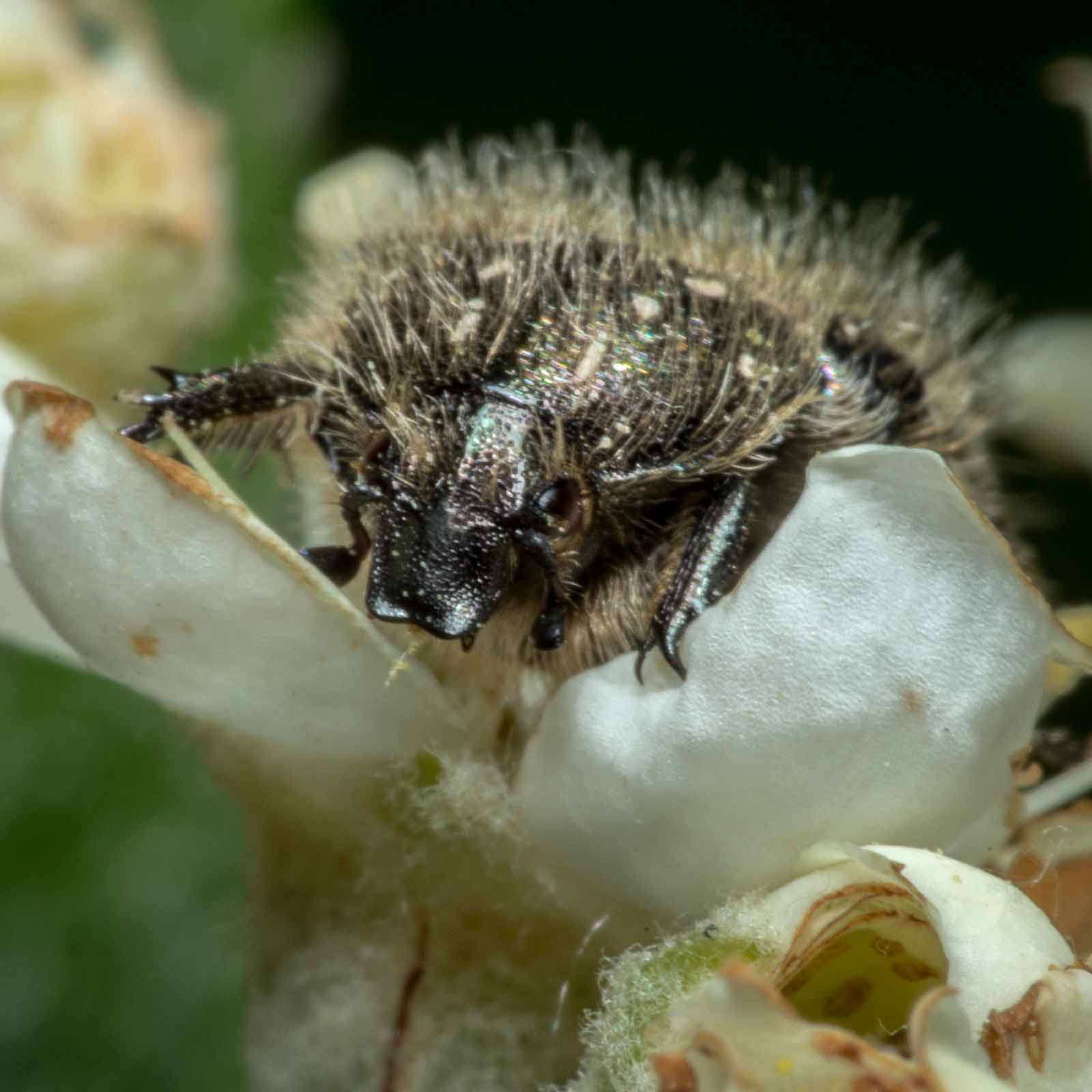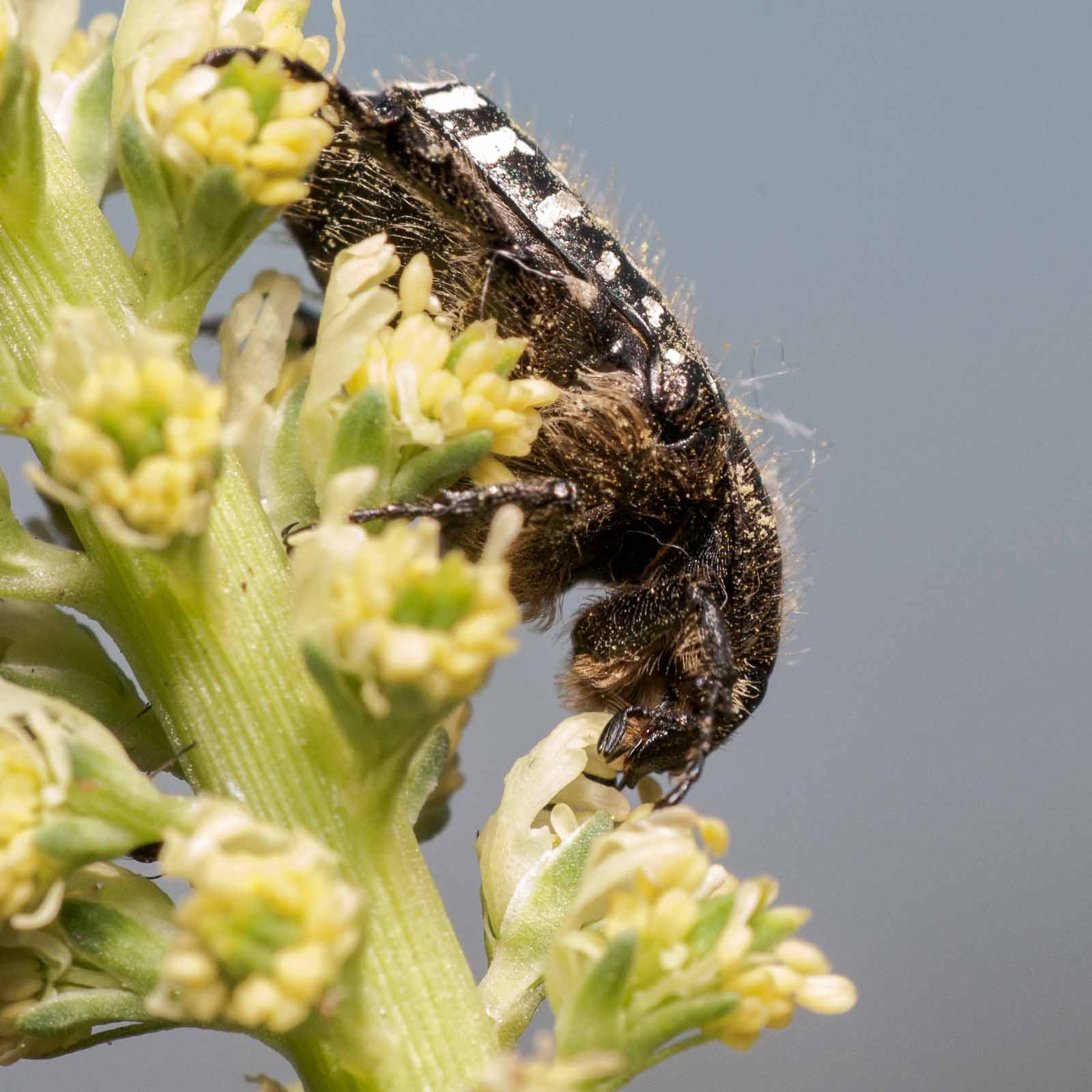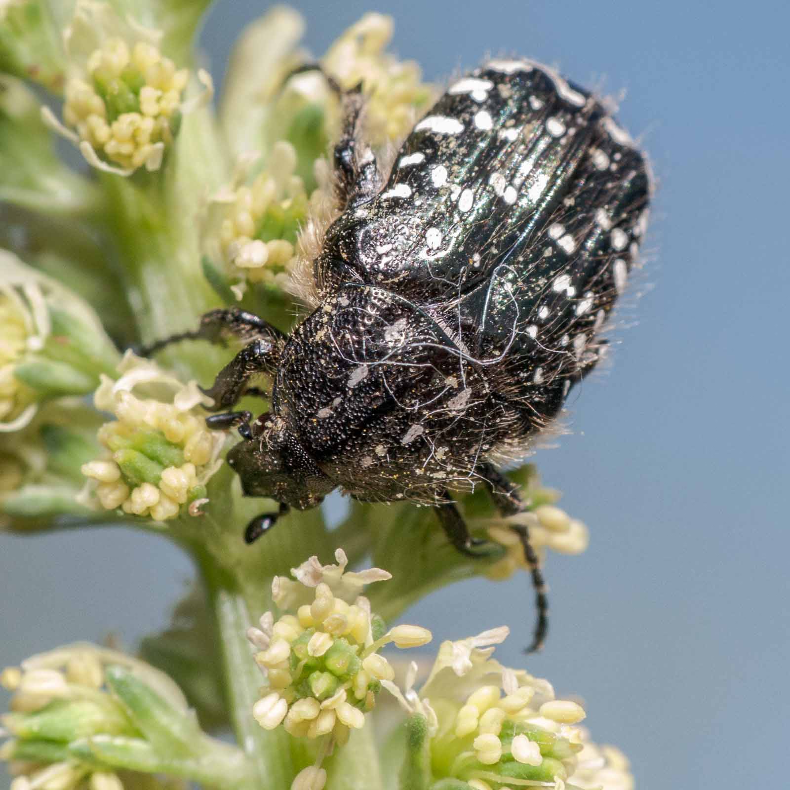Die Käfer werden 8 bis 12 Millimeter lang. Ihr Körper ist glänzend schwarz gefärbt und hat neben einer struppigen, weißen Behaarung viele kleine weiße Flecken auf den Deckflügeln, dem Halsschild und der Unterseite des Körpers. Die sechs Flecken des Halsschildes verlaufen in zwei parallelen Längsreihen beidseits der Mitte des Halsschildes, an der eine Längsschwiele ausgebildet ist. Die Deckflügel besitzen fünf erhabene Längsstreifen. Bei älteren Exemplaren sind meist keine Haare zu finden, da diese mit der Zeit abgerieben werden.