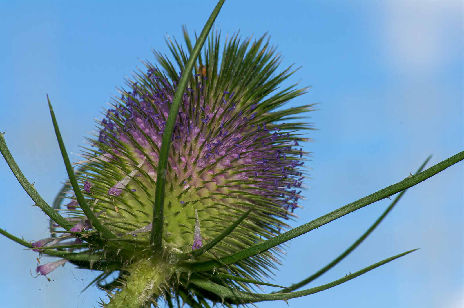 Die Blütezeit reicht von Juli bis August. Die bei einer Länge von 5 bis 8 cm eiförmig-länglichen, walzenförmigen, köpfchenförmigen Blütenstände sind von stacheligen, auffallend unterschiedlich langen und bogig aufsteigenden Hüllblättern umgeben. Die Tragblätter sind länger als die Blüte. Die Blüten sind zwittrig. Die vier violetten Kronblätter sind röhrenförmig verwachsen. Die Blüte ist blau.